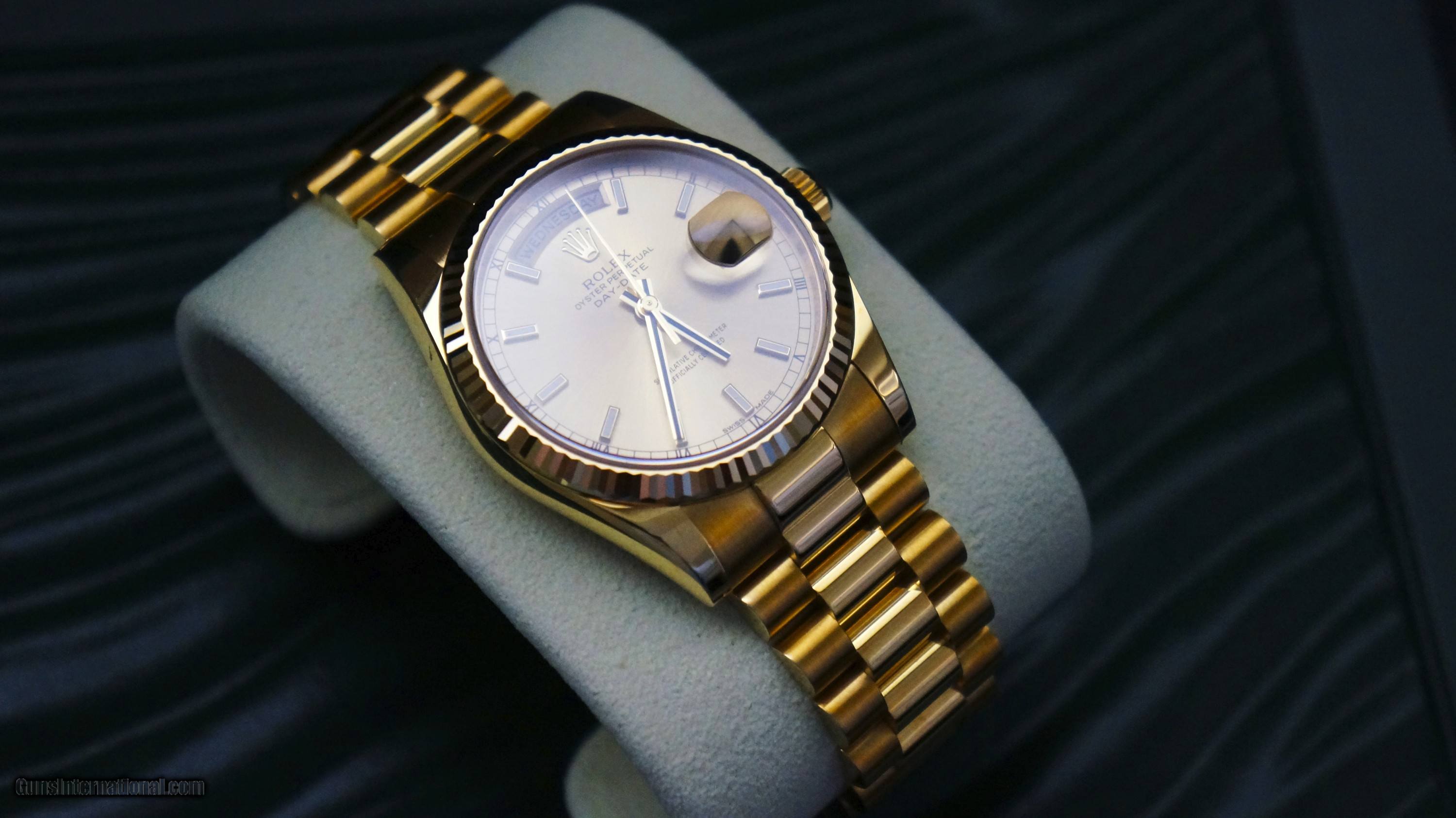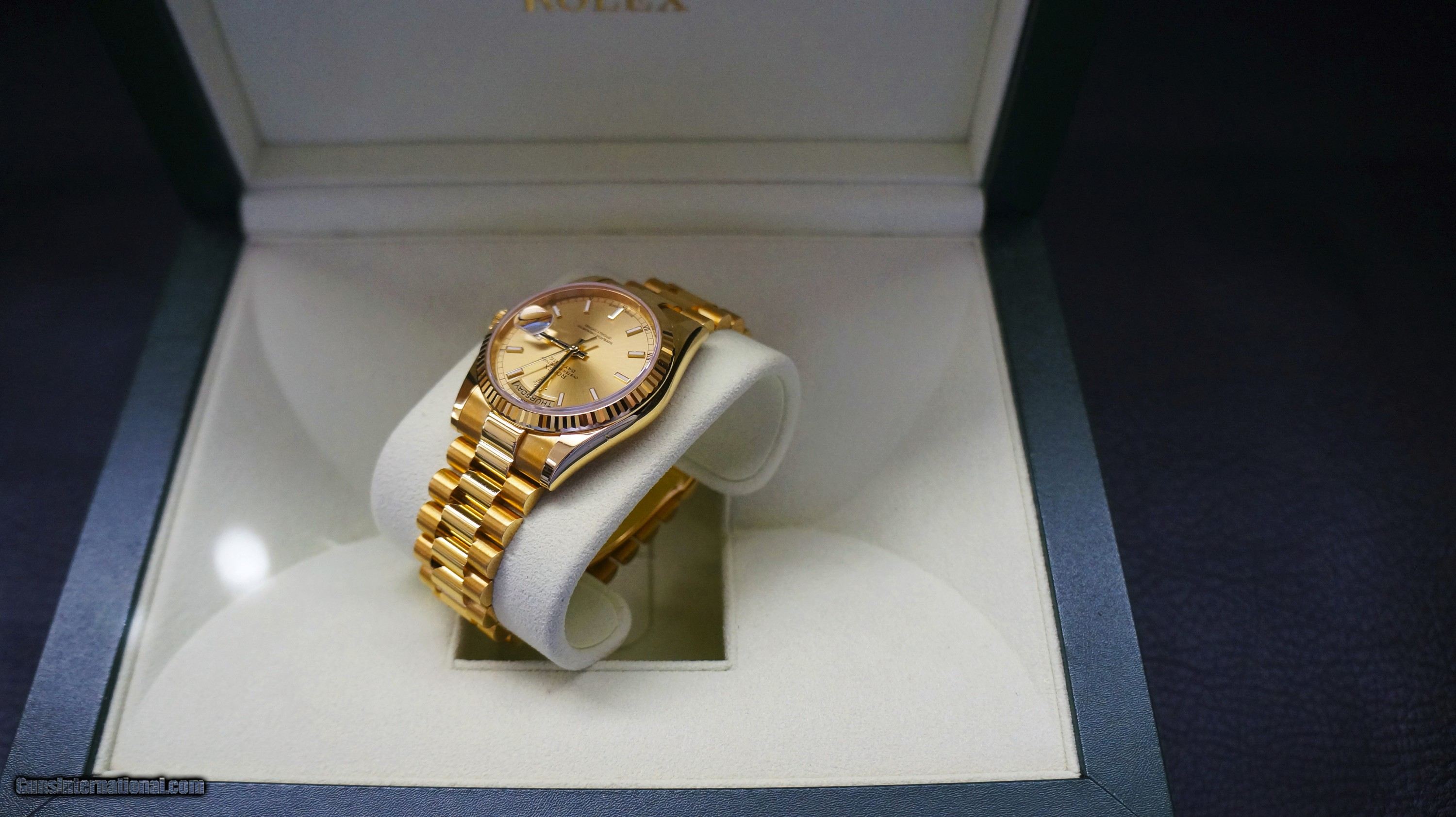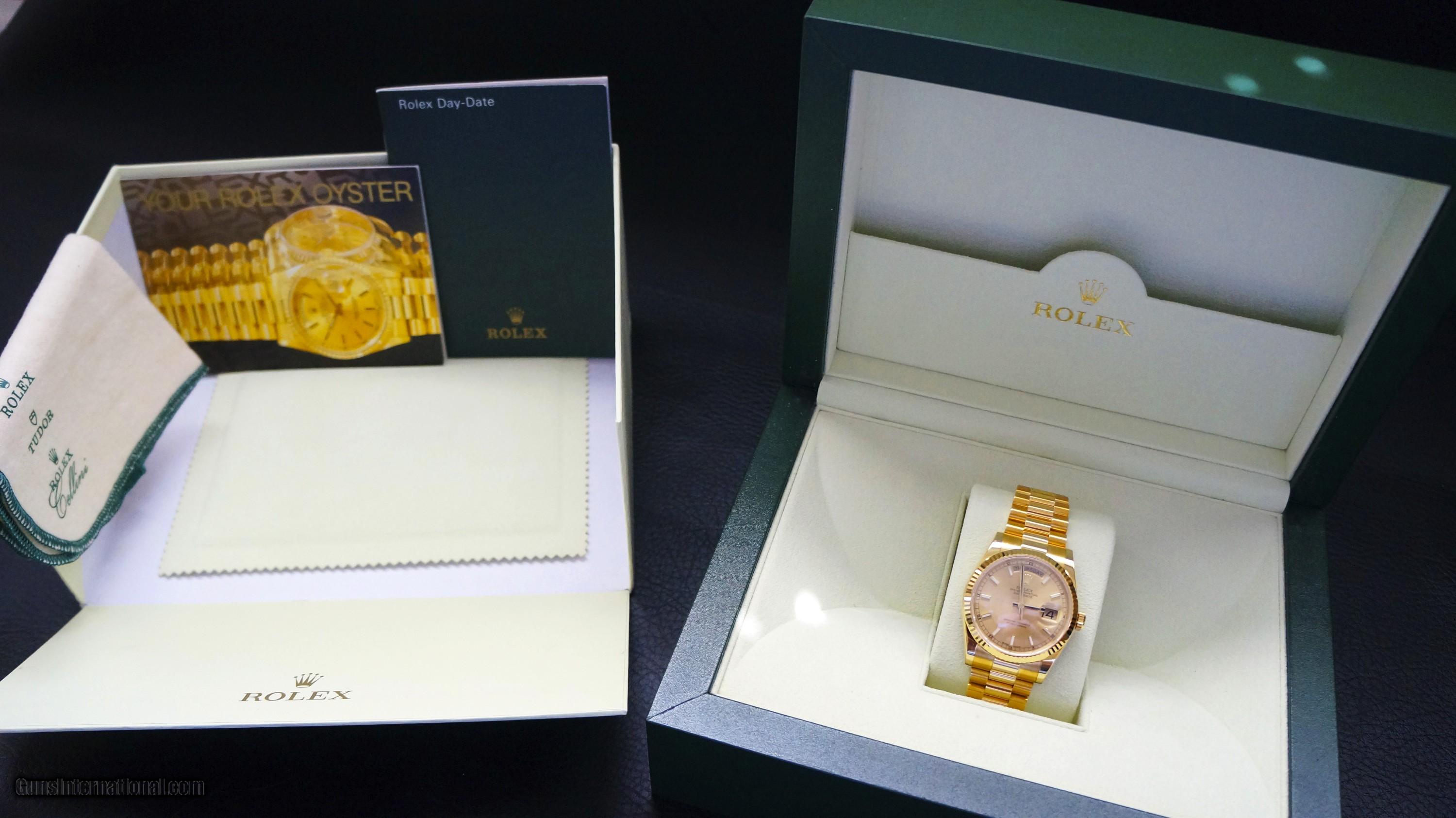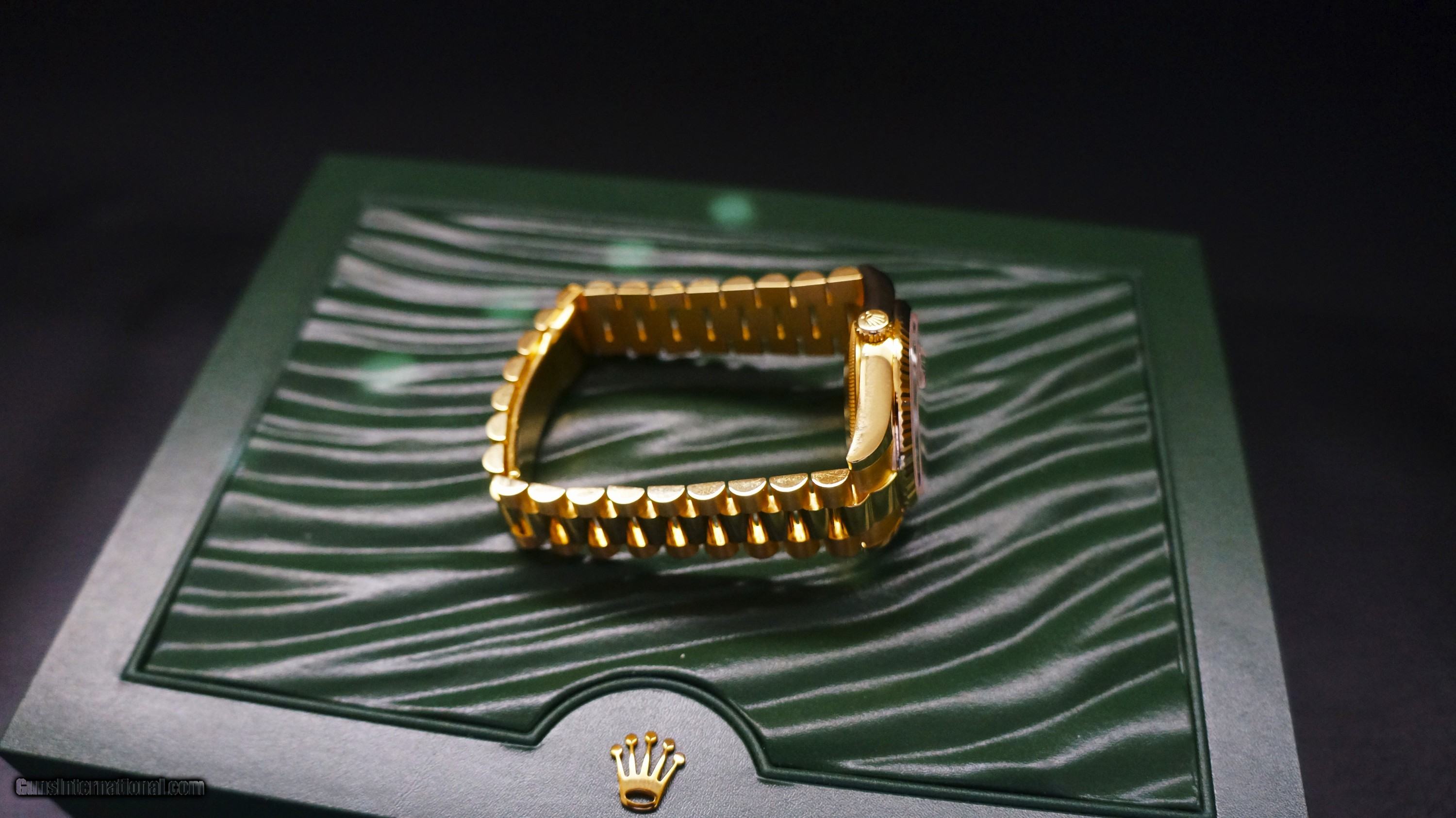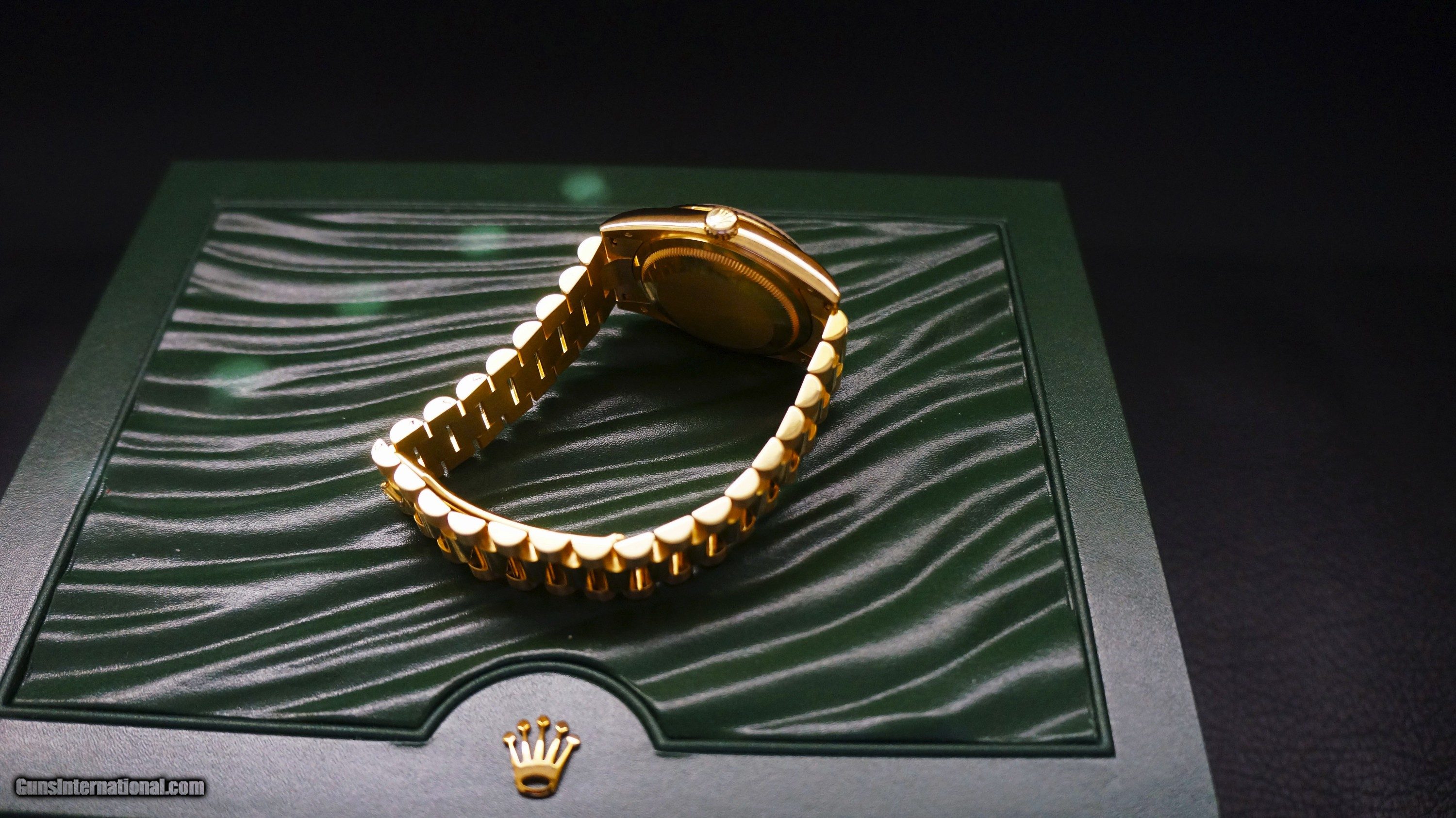 Description: *** SOLD *** Watch Specifics: An all original and unaltered 2019 Rolex Day-Date President, in new, pristine condition. Tight bracelet, has zero droop. Scratch free crystal. Movement operates at factory specs. Box and papers. Condition: A superficial 0.5 mm nick at the side of the case, not noticeable, easily removed. Otherwise, the watch is new, worn half a dozen times. Brand: Rolex Case Material: 18k Yellow Gold Bracelet: Rolex 18k Yellow Gold Hidden Folding Clasp Bezel: Fluted Gender: Men's watch/Unisex Customized: No Model: Rolex Day-Date Double Quickset Style: Luxury With Original Box/Packaging: Yes With Papers: Yes Case Size: 36 mm Water resistance: 10 ATM Crystal: Sapphire Crystal Dial: Champagne Dial numerals: Stick Luminescent Reference Number: 118238 SOLD |