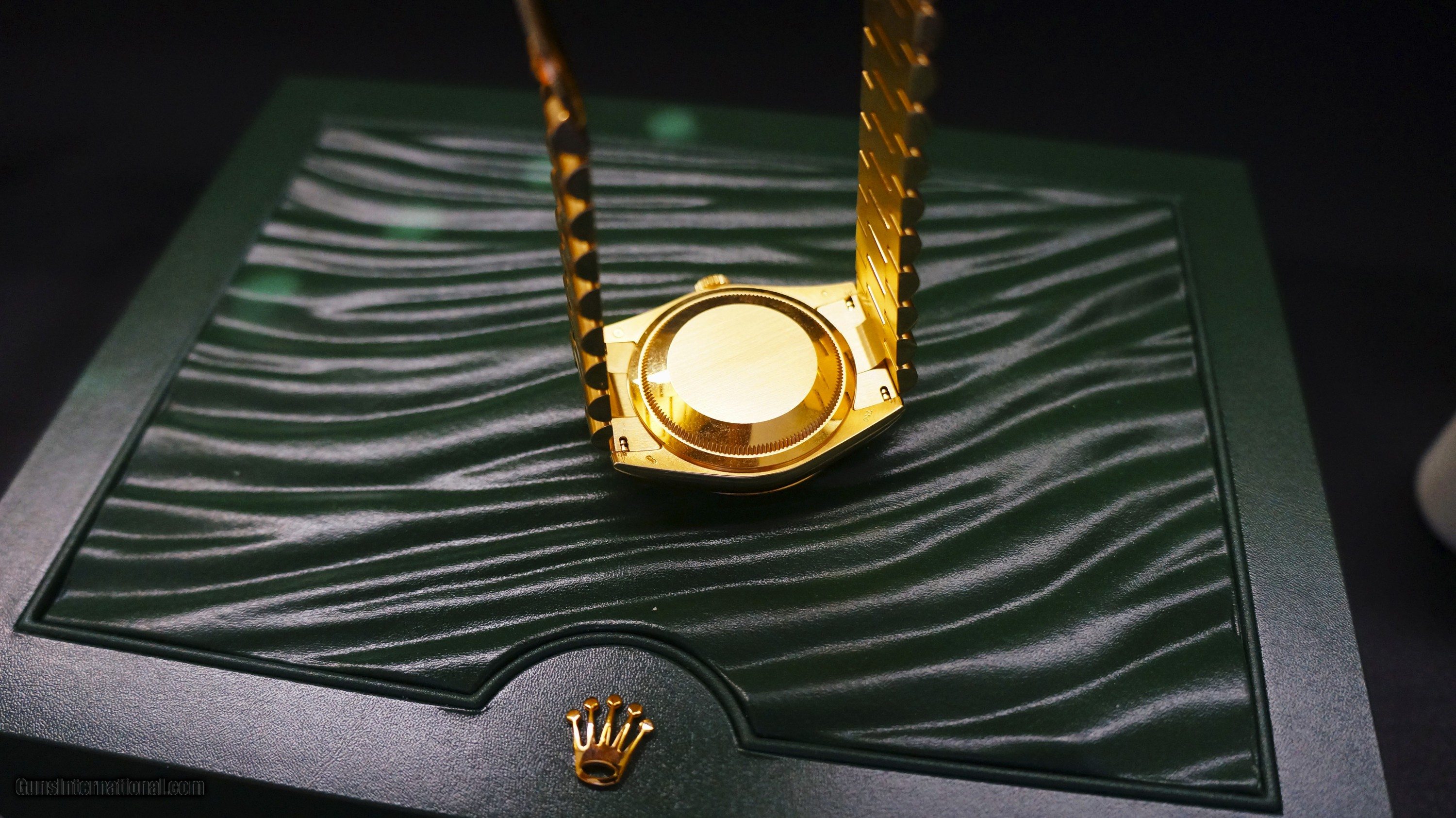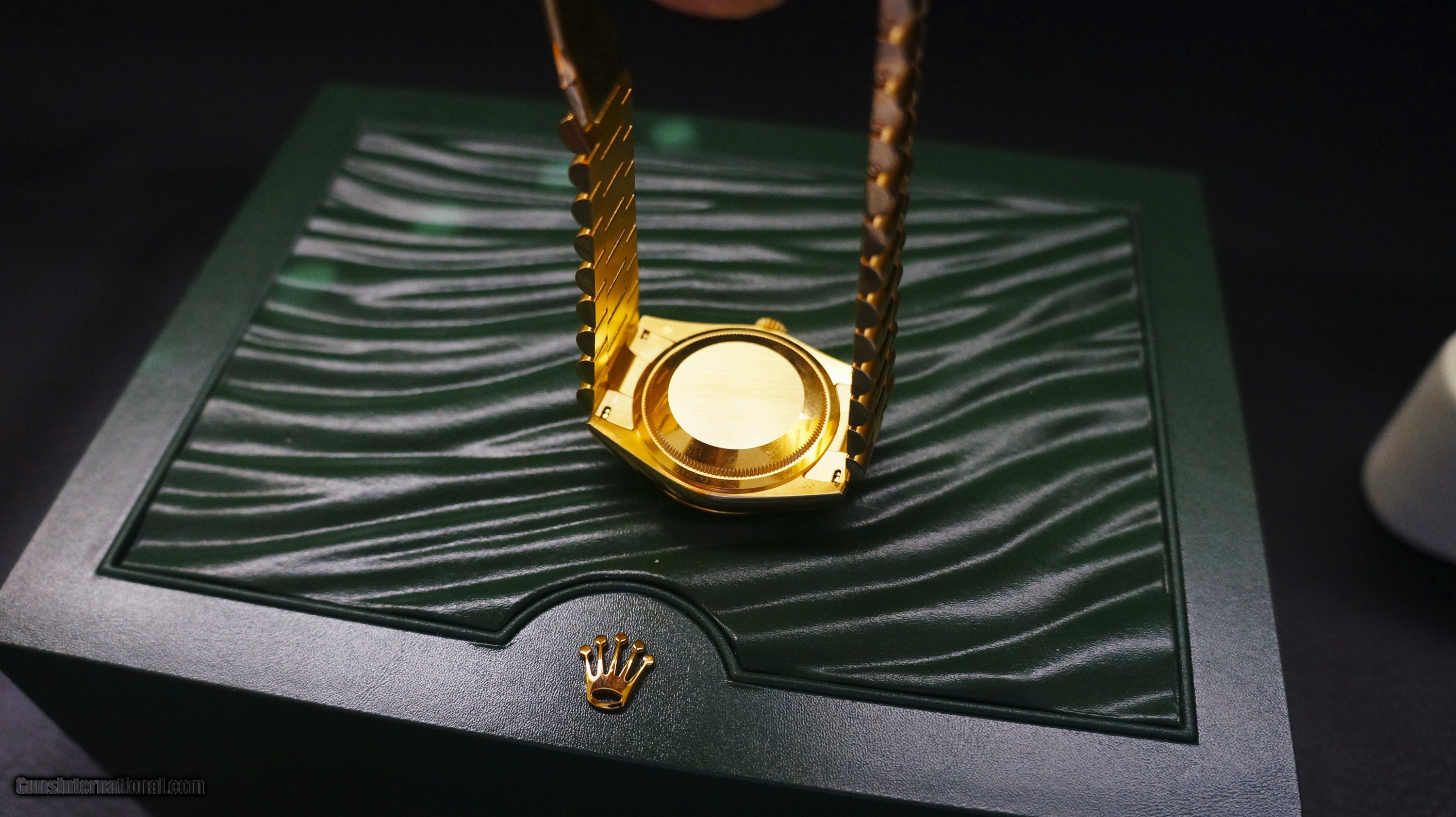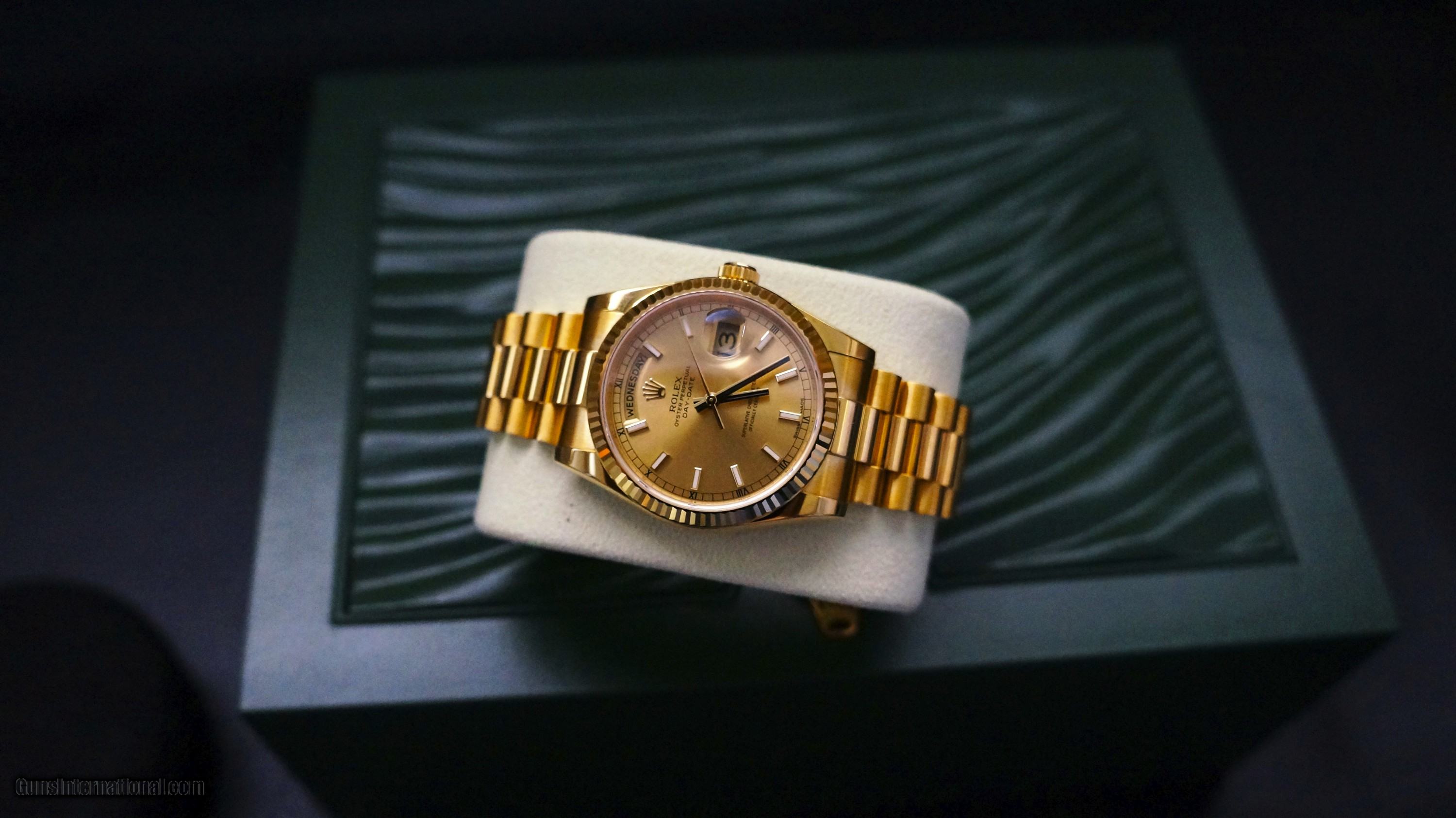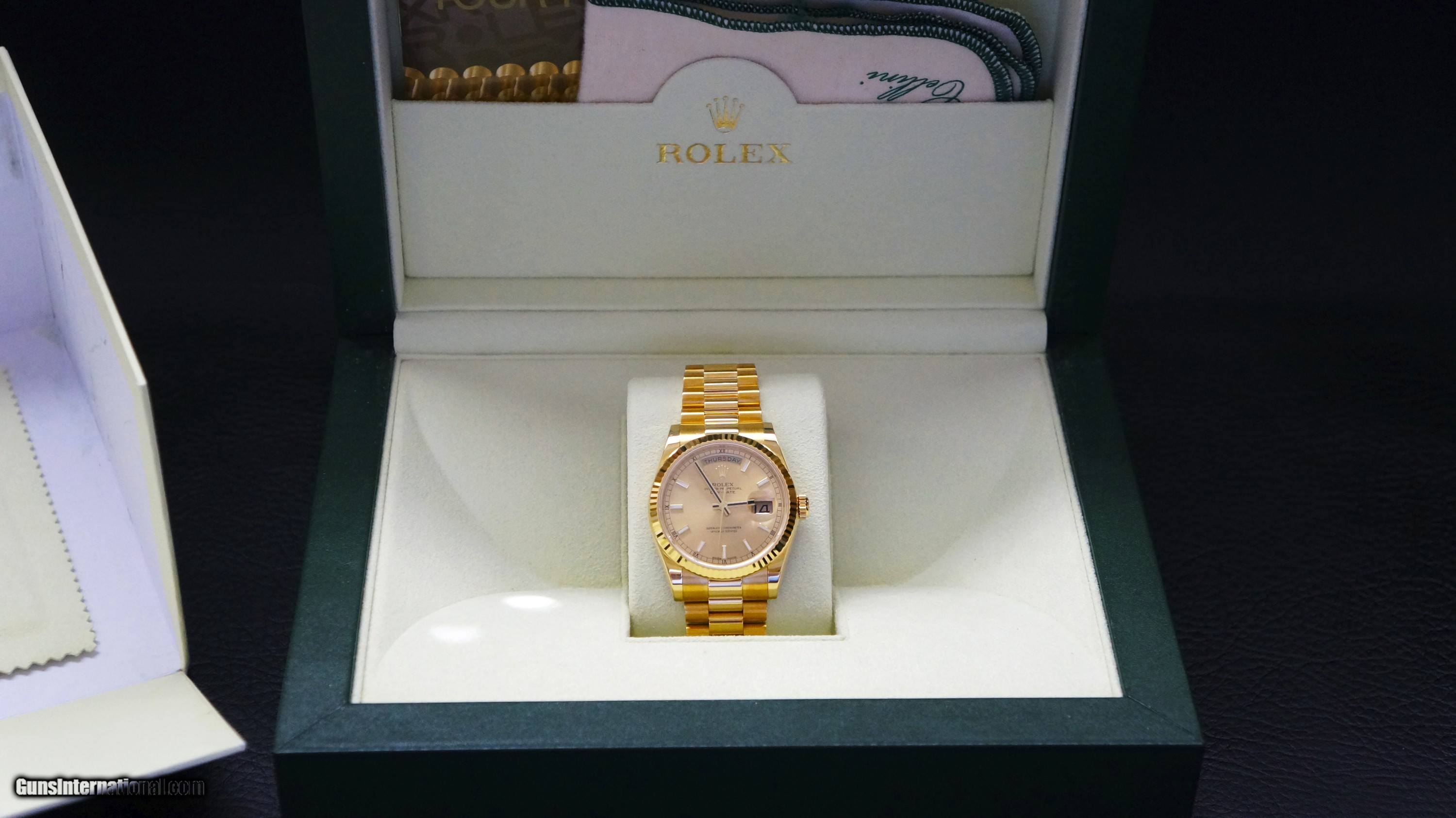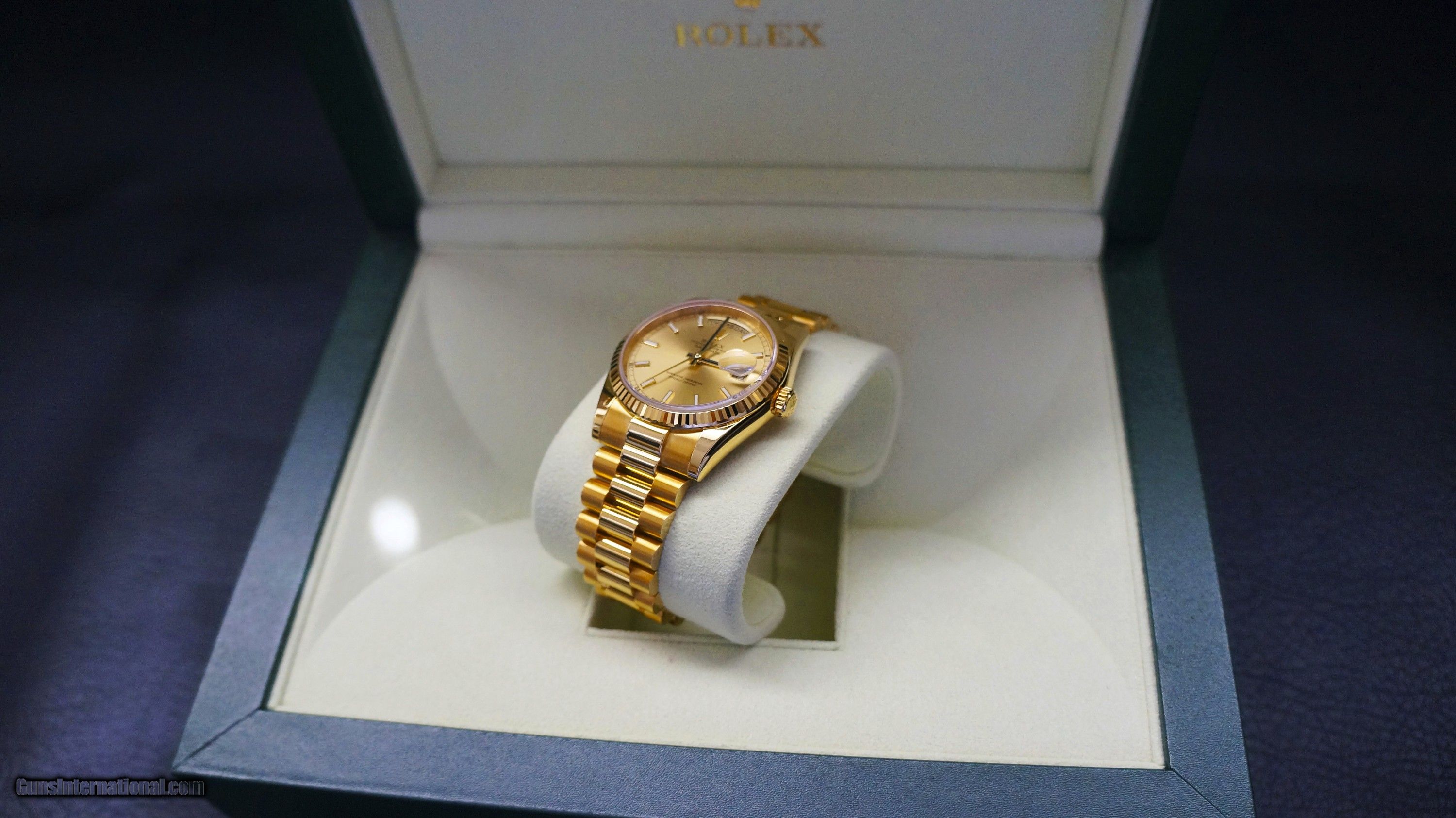 Description: *** SOLD *** Watch Specifics: An all original and unaltered 2019 Rolex Day-Date President, in new, pristine condition. Tight bracelet, has zero droop. Scratch free crystal. Movement operates at factory specs. Box and papers. Condition: A superficial 0.5 mm nick at the side of the case, not noticeable, easily removed. Otherwise, the watch is new, worn half a dozen times. Brand: Rolex Case Material: 18k Yellow Gold Bracelet: Rolex 18k Yellow Gold Hidden Folding Clasp Bezel: Fluted Gender: Men's watch/Unisex Customized: No Model: Rolex Day-Date Double Quickset Style: Luxury With Original Box/Packaging: Yes With Papers: Yes Case Size: 36 mm Water resistance: 10 ATM Crystal: Sapphire Crystal Dial: Champagne Dial numerals: Stick Luminescent Reference Number: 118238 SOLD |
