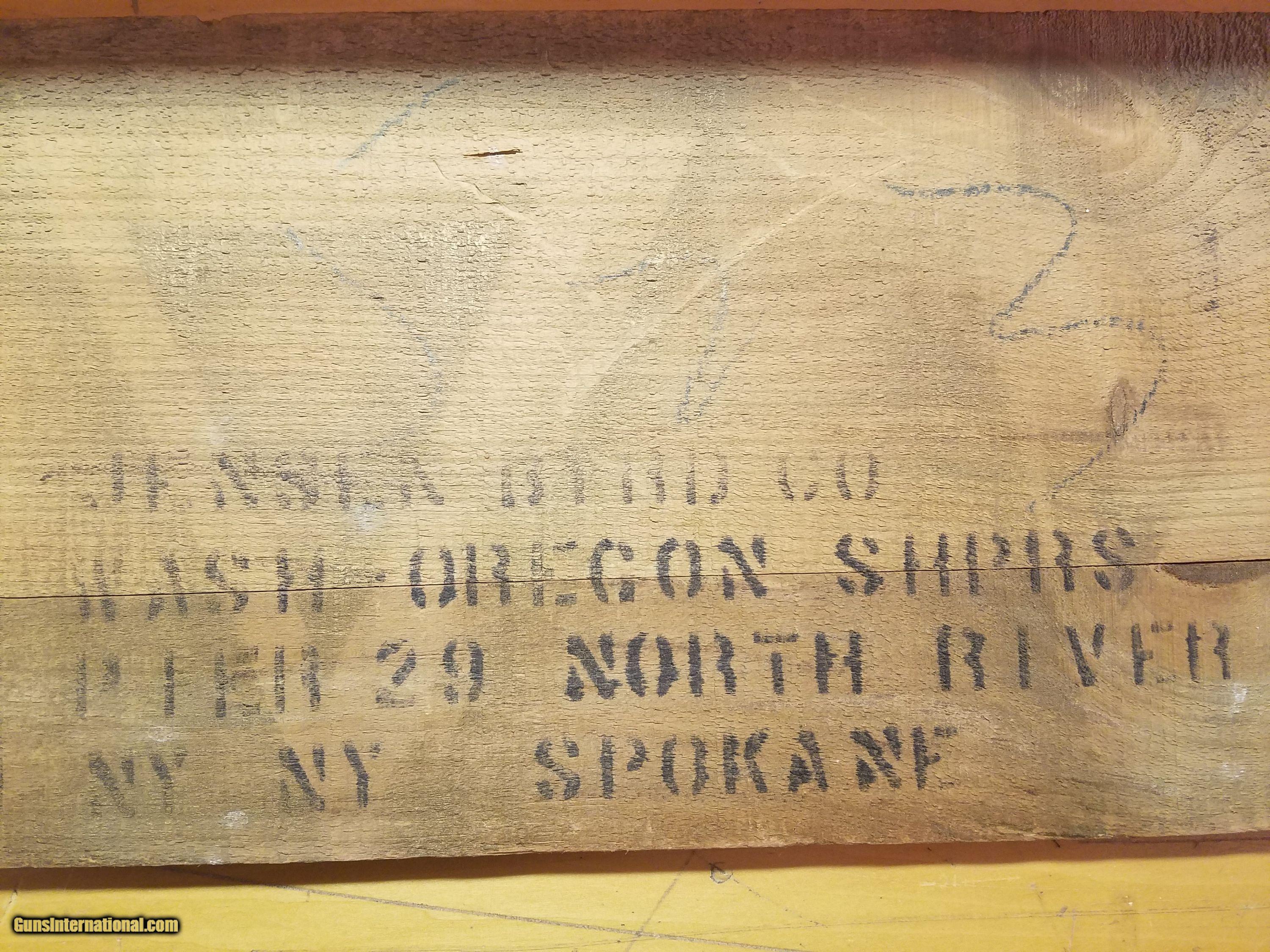 Description: Winchester Model 52 Target original factory wood shipping box. All wood is intact with no broken pieces. Complete with all interior shipping dogs {see pictures}. Original shipping tag has small corner missing, top apears to have had light cleaning but all factory stencils are legible. Would describe it at 95%. SOLD |