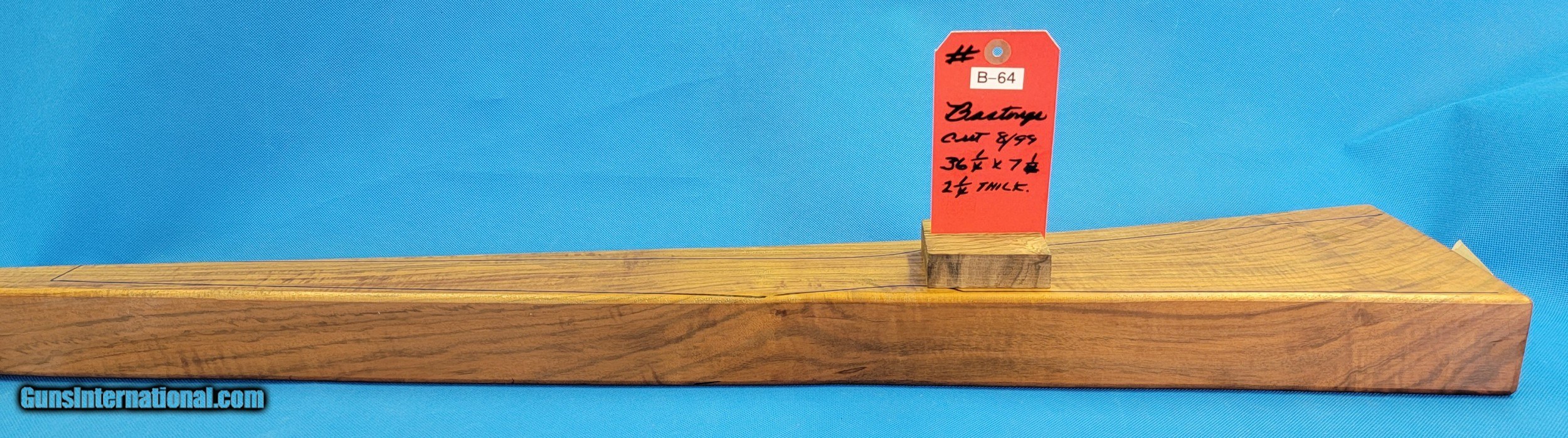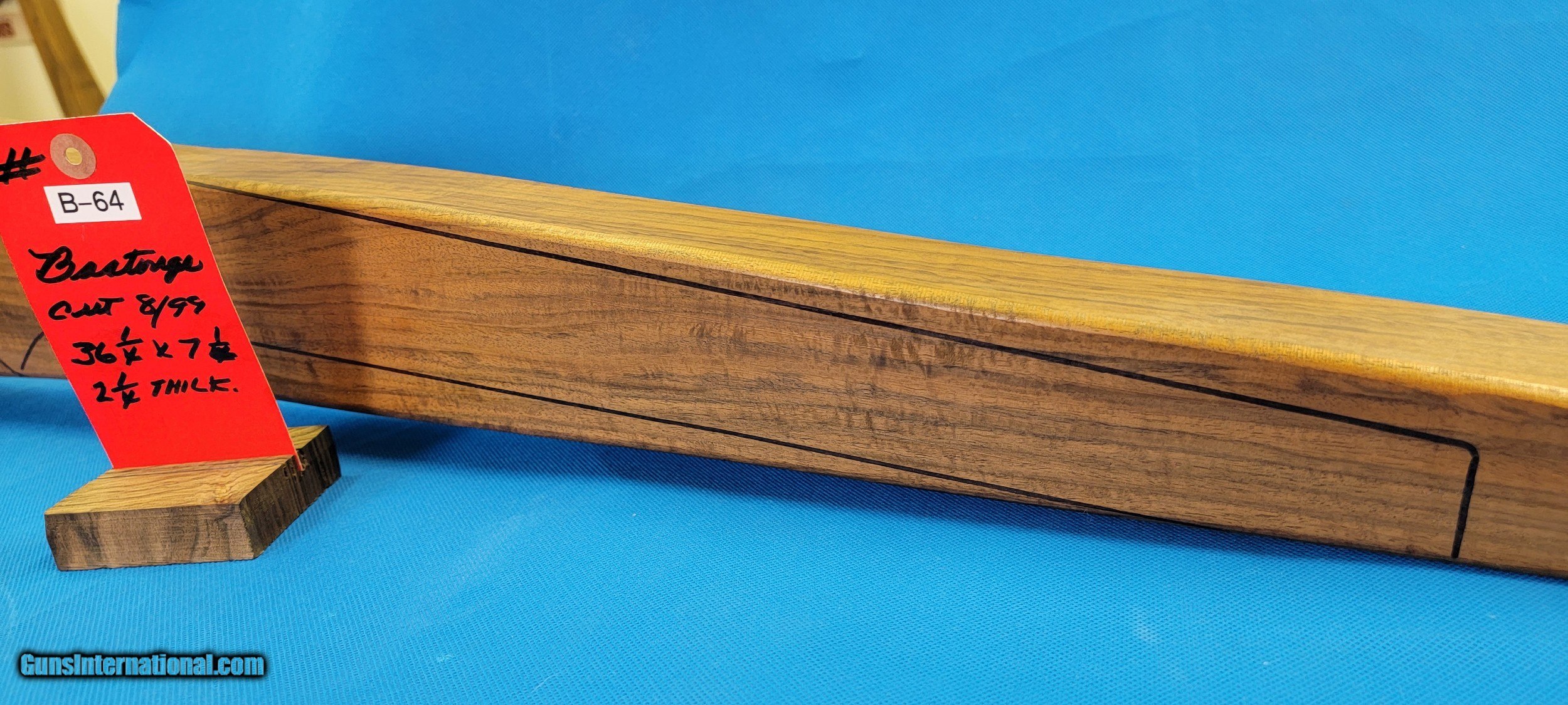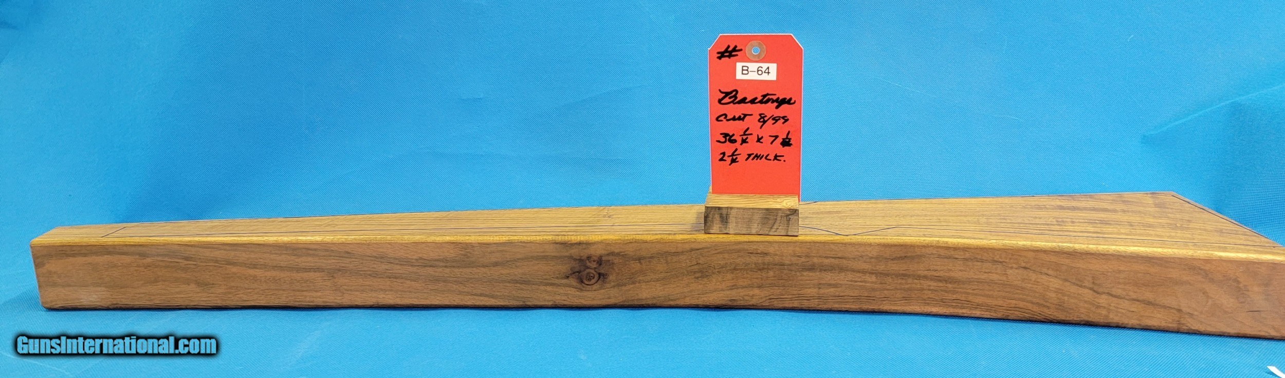 Description: A conservative piece of Bastogne walnut. Great layout and dense with mild fiddleback. There are a couple of small knots on the bottom of the blank around where the mag box would be. Probably not a problem but I understand it's hard enough to buy blanks online without dealing with knots so I am dangling a carrot. The original price on this air dried blank that was cut back in 1999 is $600.00 but the price has been cut to $400.00 . Vegetables are good for you! This blank is ready to carve! SOLD |