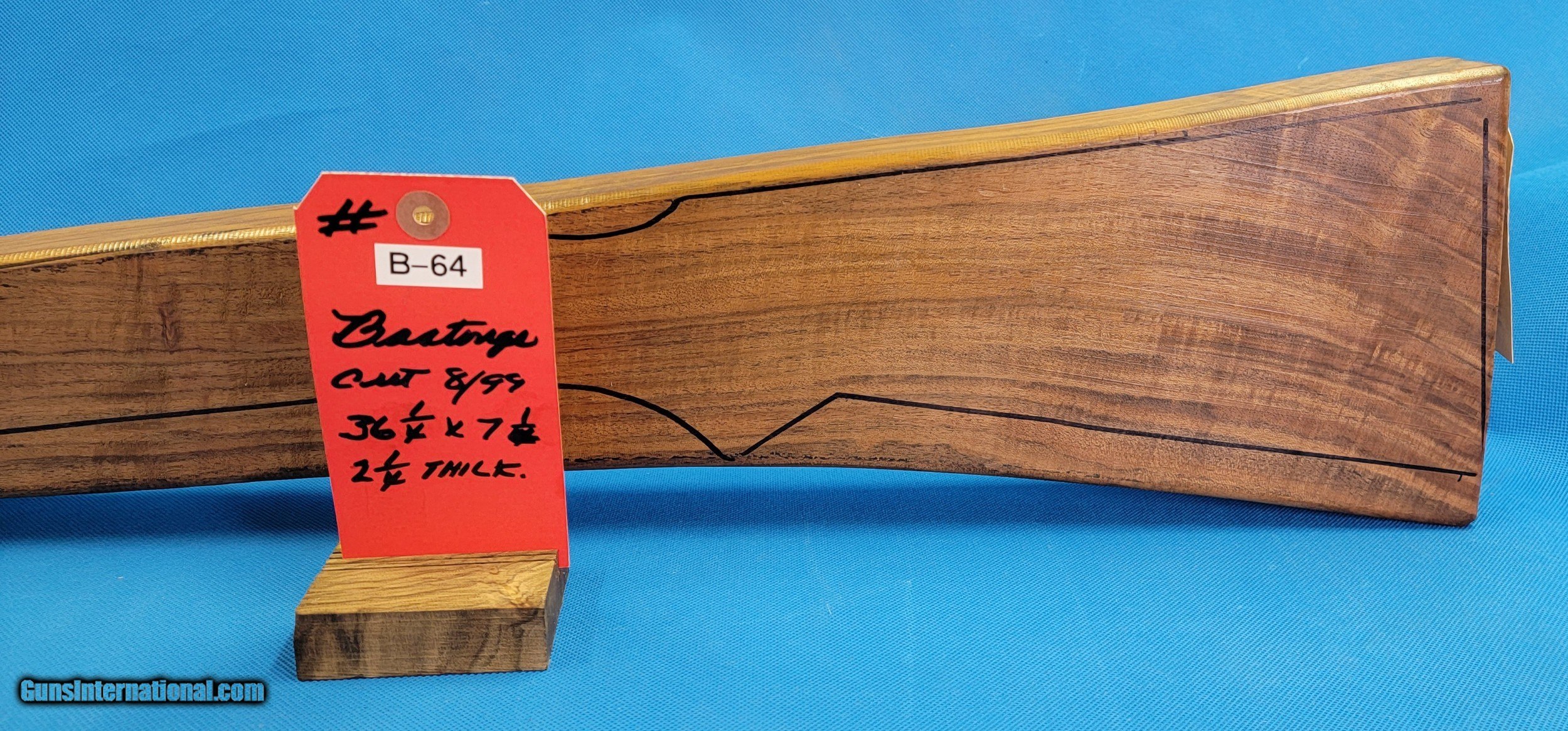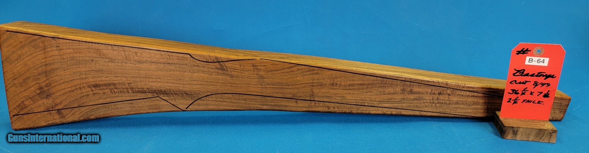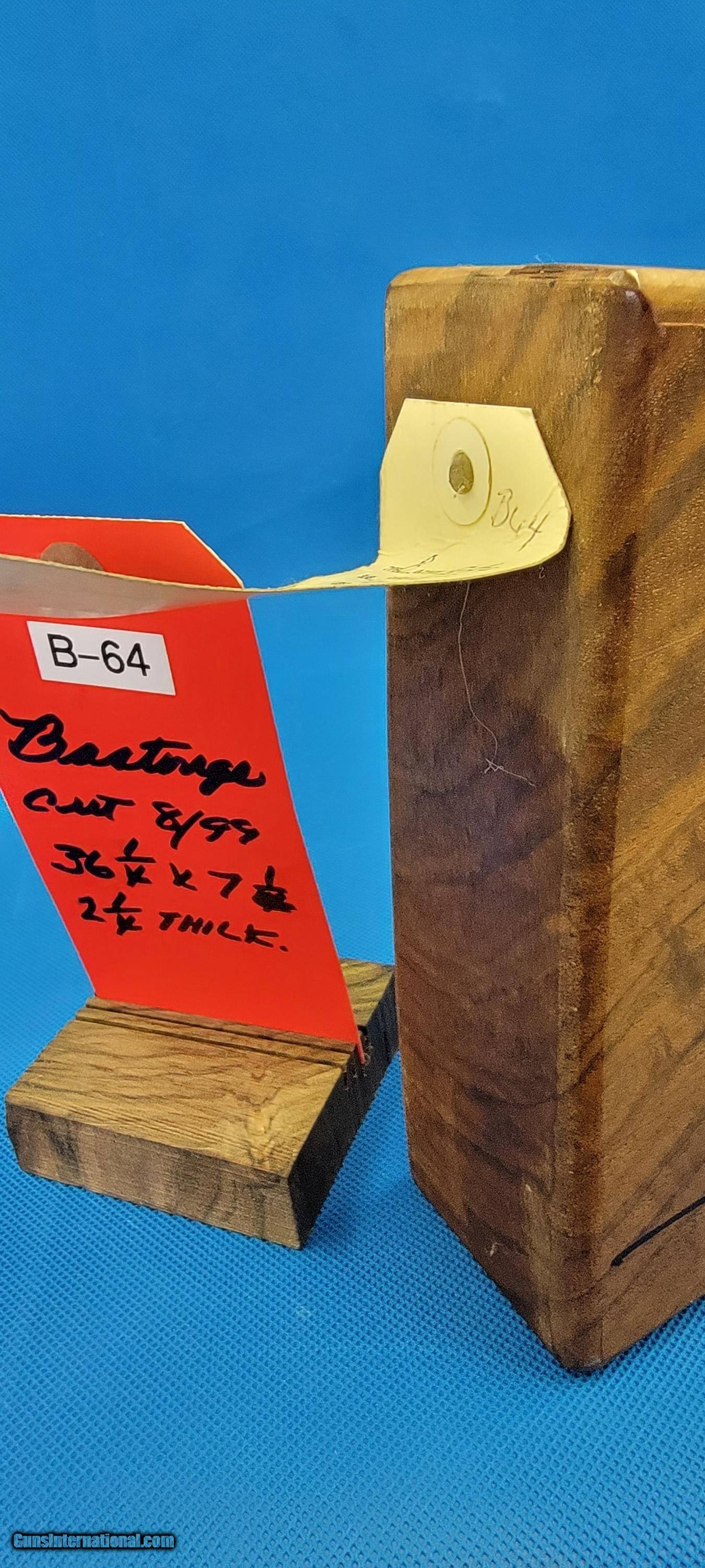 Description: A conservative piece of Bastogne walnut. Great layout and dense with mild fiddleback. There are a couple of small knots on the bottom of the blank around where the mag box would be. Probably not a problem but I understand it's hard enough to buy blanks online without dealing with knots so I am dangling a carrot. The original price on this air dried blank that was cut back in 1999 is $600.00 but the price has been cut to $400.00 . Vegetables are good for you! This blank is ready to carve! SOLD |