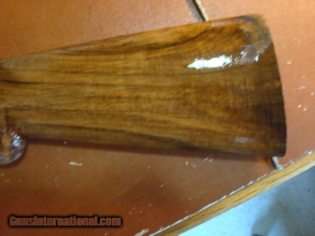Description: This English walnut blank stock and forearm inletted for a 12 gauge Winchester 101 cost me nearly $500.00 years ago. Sold the shot gun and do not need it now. I have dampened the wood in places so you can see the grain better in the photos. Wood is in excellent condition and well dried. It was shaped for a 14 1/4 Inch pull without a recoil pad, drop at heel 2 1/4, drop at comb 1 1/2, No cast but could be finished to 1/8 inch on or off cast. Will ship in the lower 48 states for $12.00. SOLD |