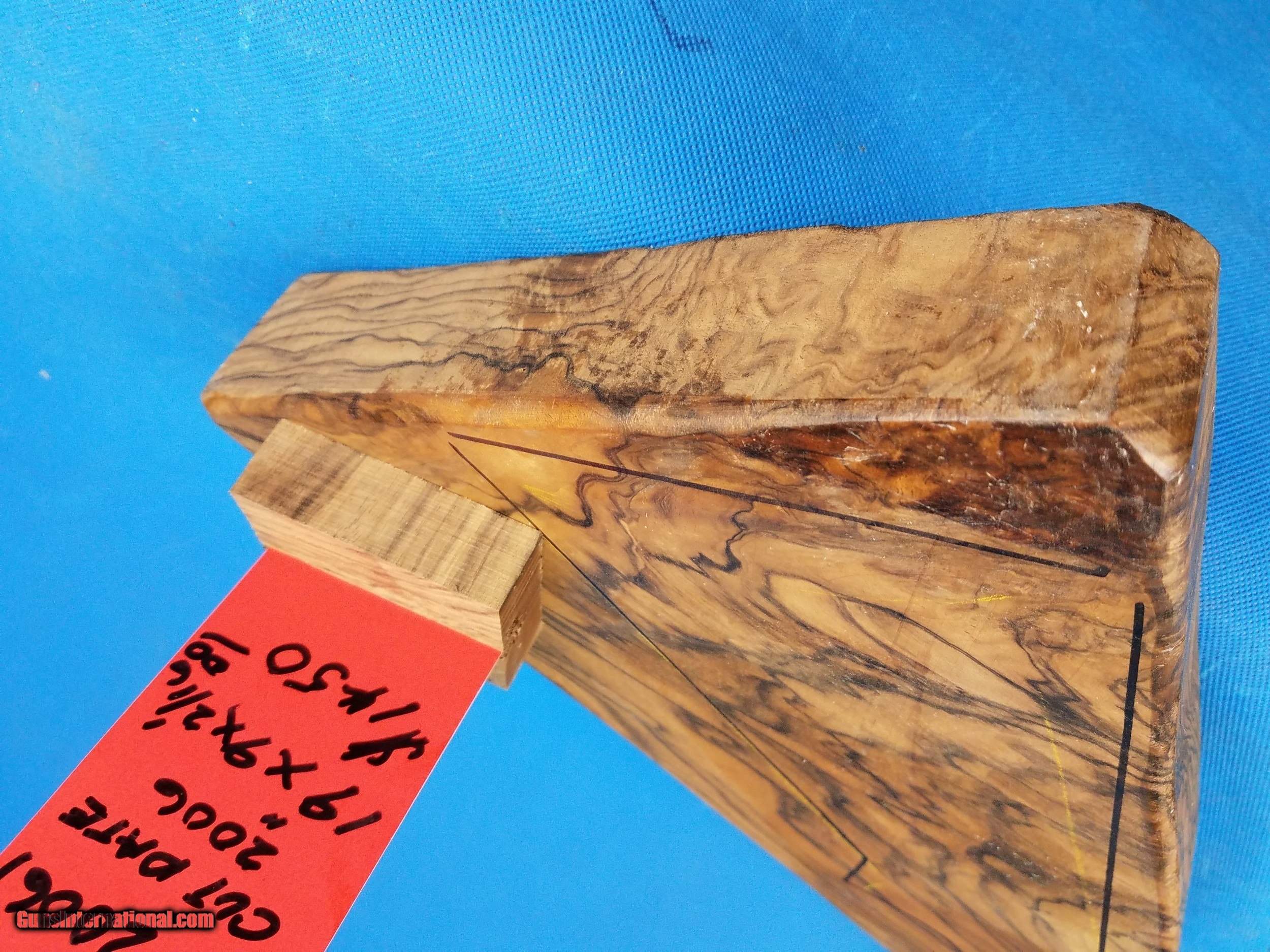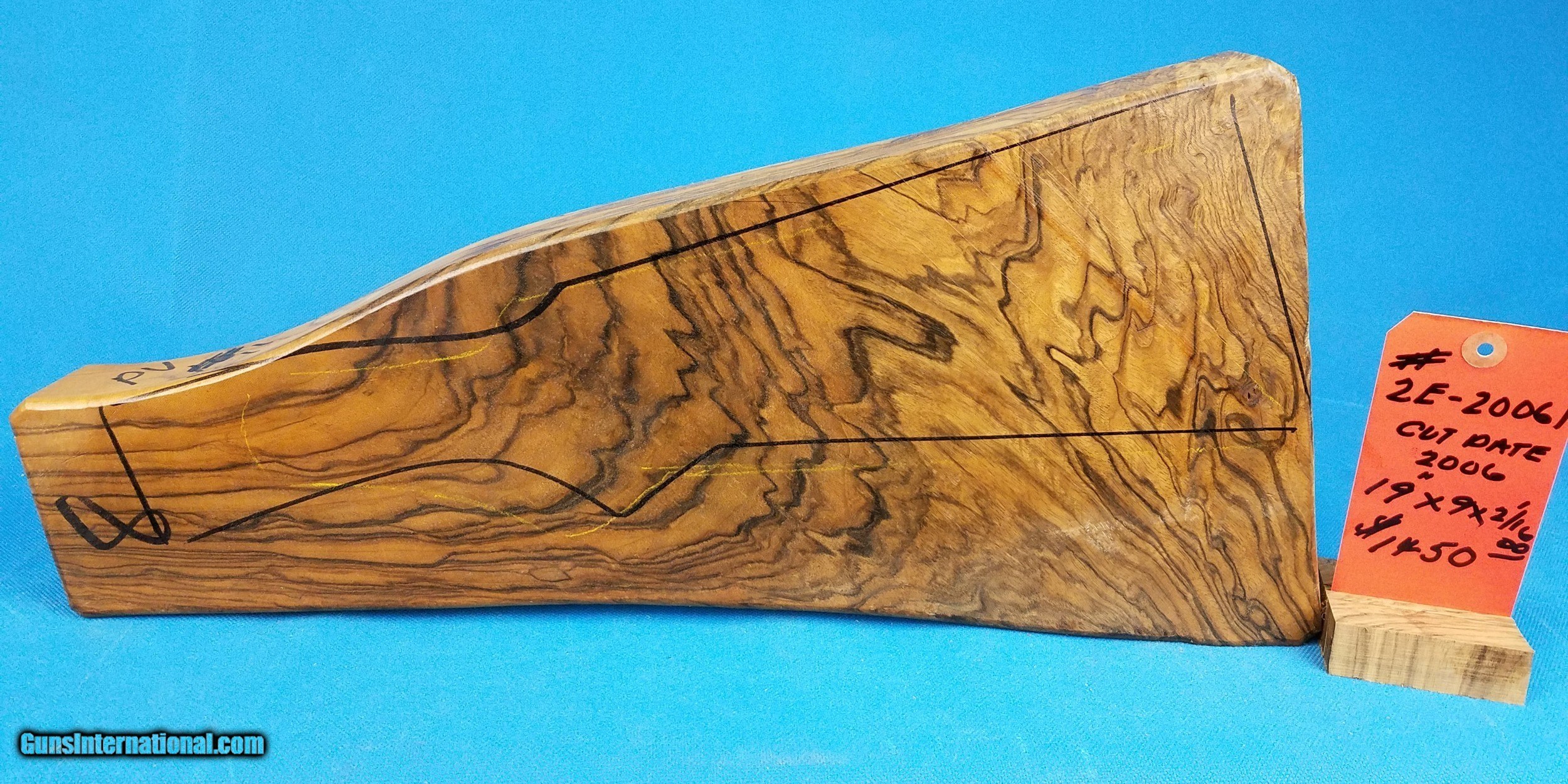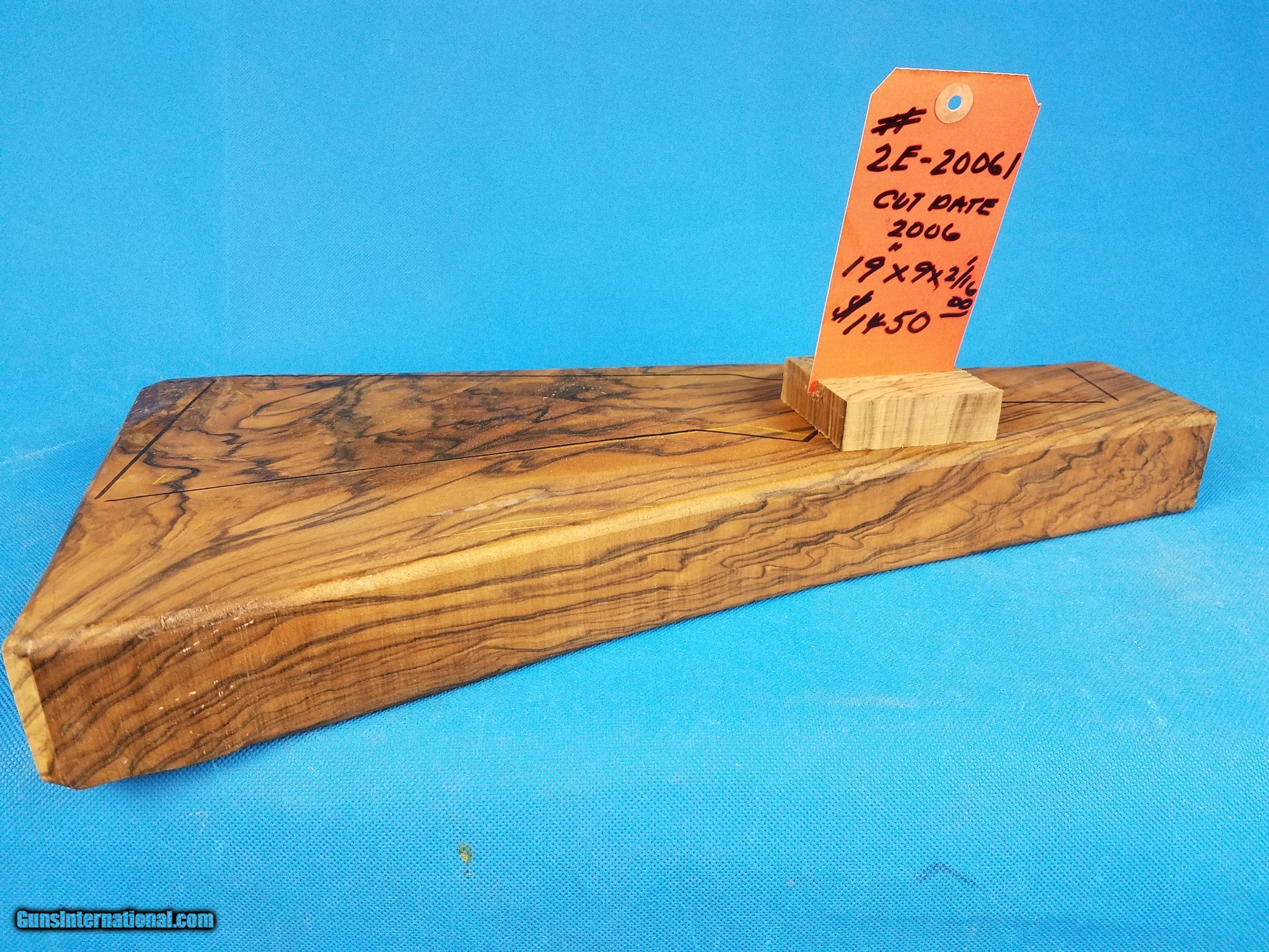 Description: A stunning piece of California English walnut. At 2 1/6 inches thick it is probably best for shotgun or rifle with no cheek piece. In most cases there is enough room in the blank for a forearm. At 15 years since it was cut , it is READY TO CARVE! Or, buy it just to admire. In celebration of the remarkable life of legendary stockmaker JERRY FISHER this blank will be accompanied by one of Jerry's state of the art grip caps and screw. Size and style purchasers choice. SOLD |