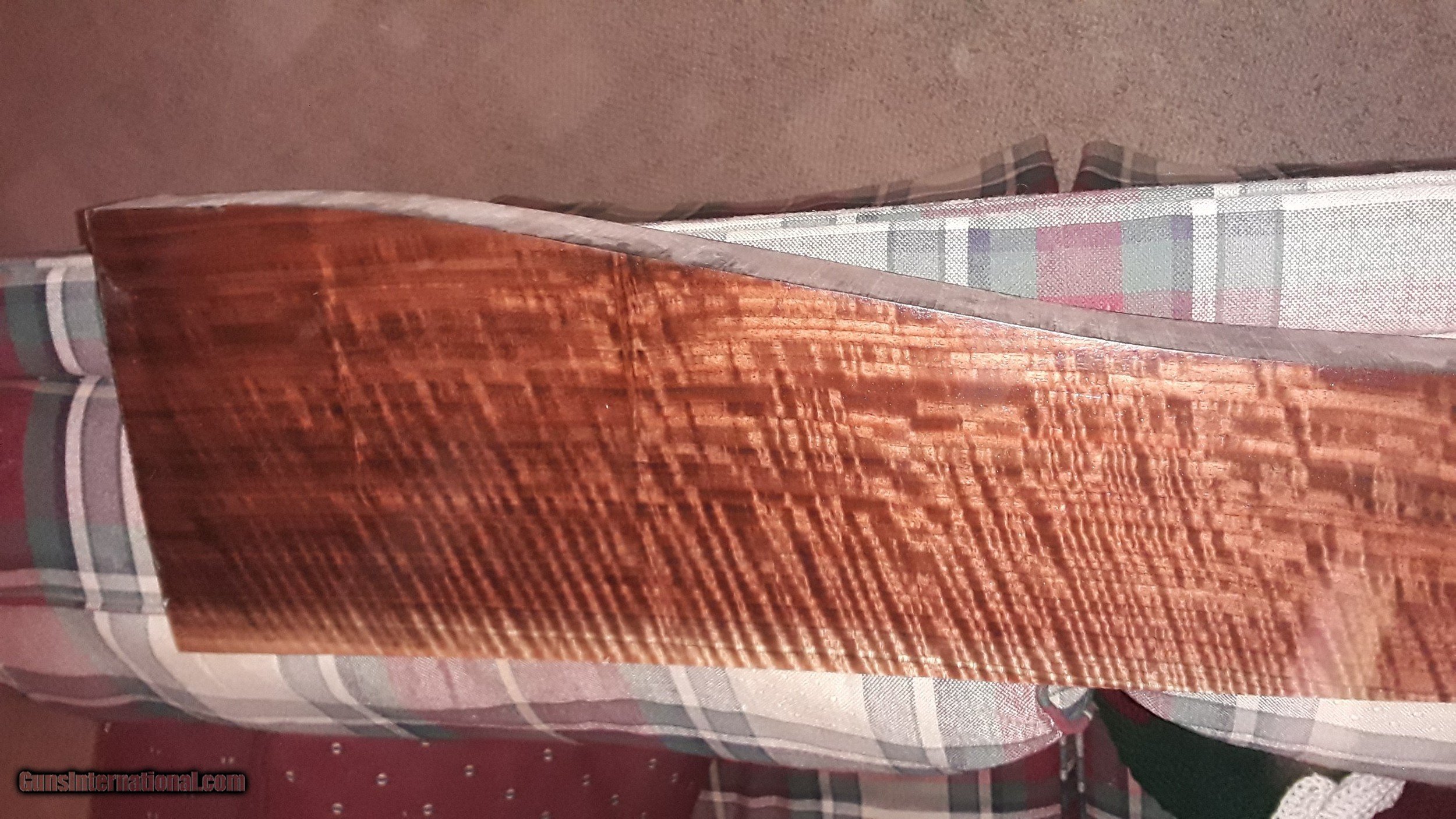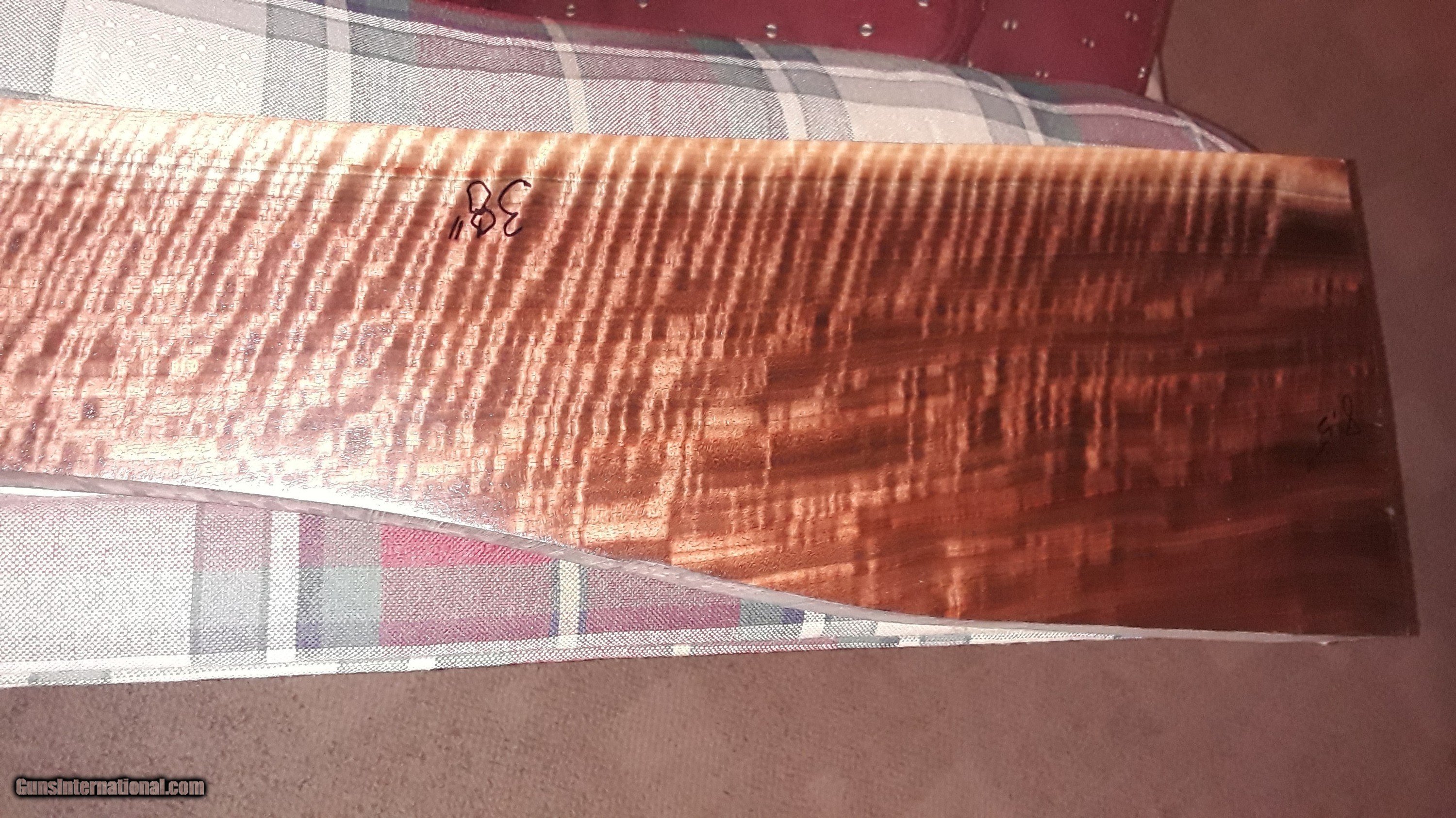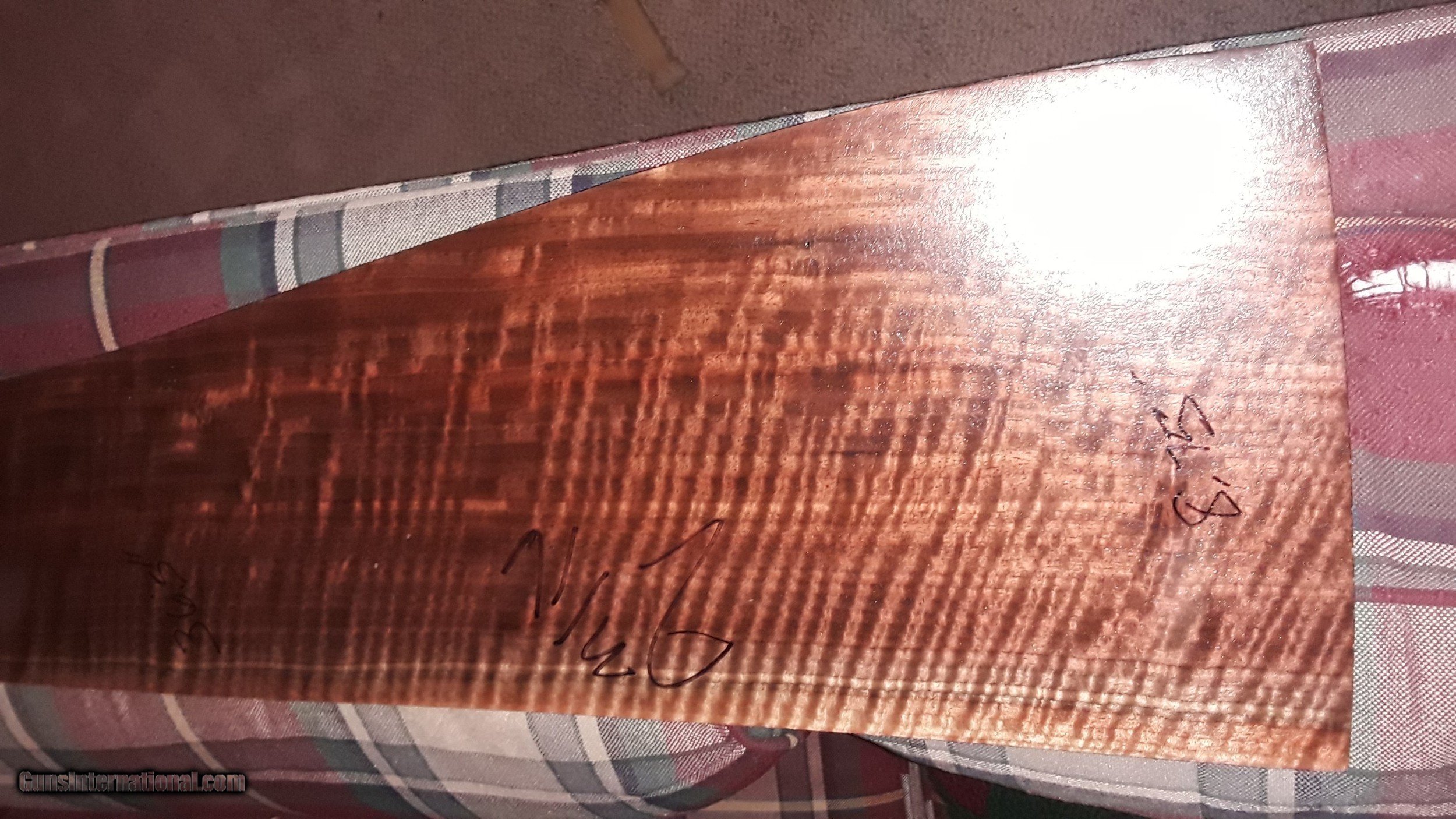 Description: 2 pieces of feather crotch american walnut rifle blanks. Could be used for 2 piece shotgun blanks as well and would provide nice matching grain forend. $370 each or the pair for $700. These are cut 1 and 2 so they are a match pair. Well dry and clear coated to show off the color and grain. Plus shipping SOLD |
