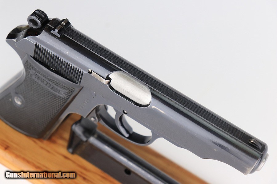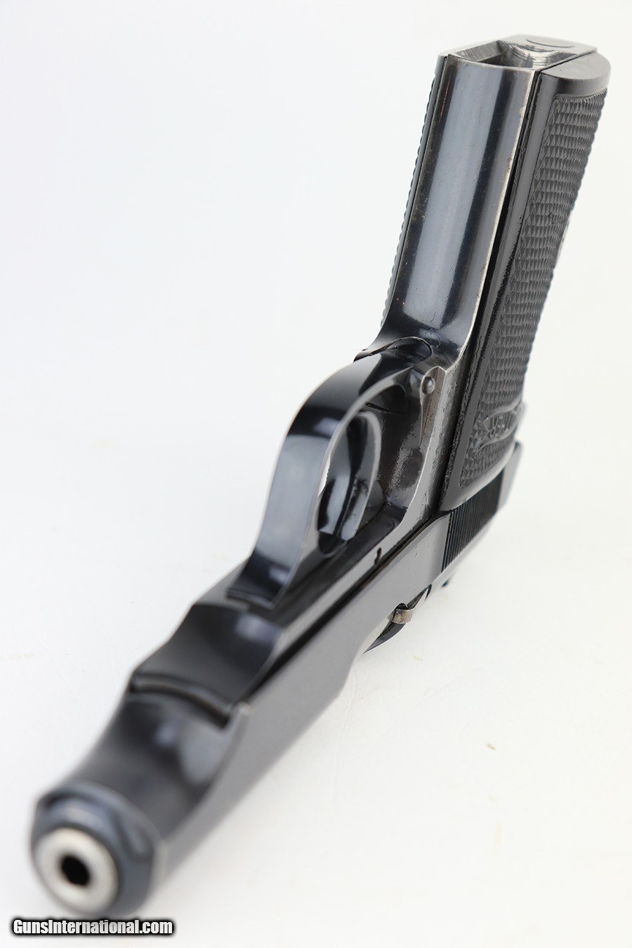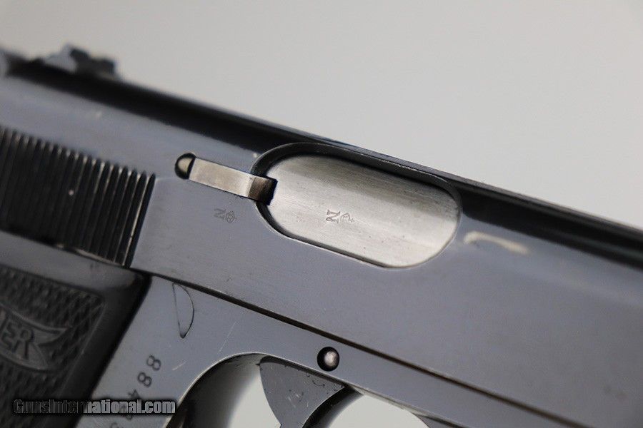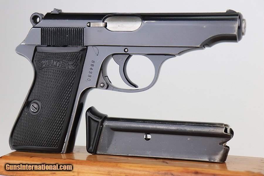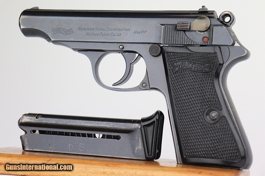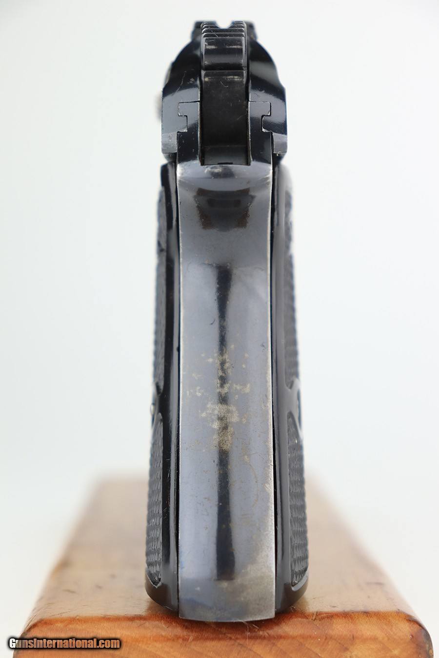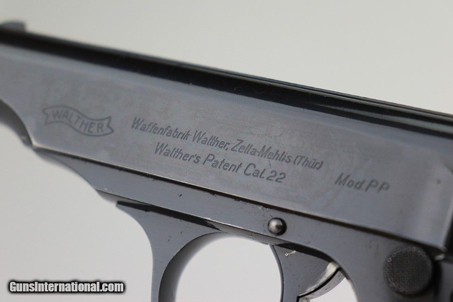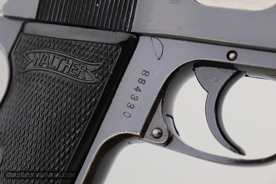 Description: This is a very nice example of a scarce .22 Caliber Walther PP sold in the commercial market in 1935. It is all matching and has the proper "Crown N" commercial proofs. It has retained about 93% of its original high polish finish. The majority of the finish loss is on the back strap where there is some light spotty wear. There is also minor muzzle wear, a few small spots of wear along the right side of the slide, and some very light scratchy wear on the front strap. Fitted with an excellent set of period-correct black bakelite grips. Comes with a period-correct black finger extension magazine. The bore is like-new. SOLD Curio/Relic: Yes Handgun Caliber: .22 Long Rifle |