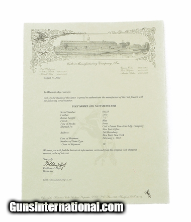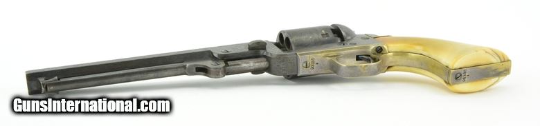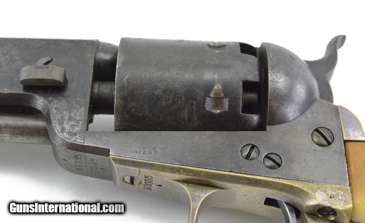 Description: Colt 1851 Navy .36 caliber revolver. With Hartford address and factory letter. Letters with grips (grips on gun are correct for a ’51 Navy but probably did not come on this gun. Looks very nice.) Gun retains 92% blue and has an excellent cylinder scene. Very good case colors on lever. Frame colors are visible, but faint. Eye catching 1851 lettered Navy.