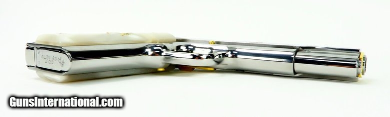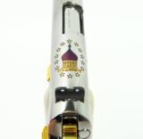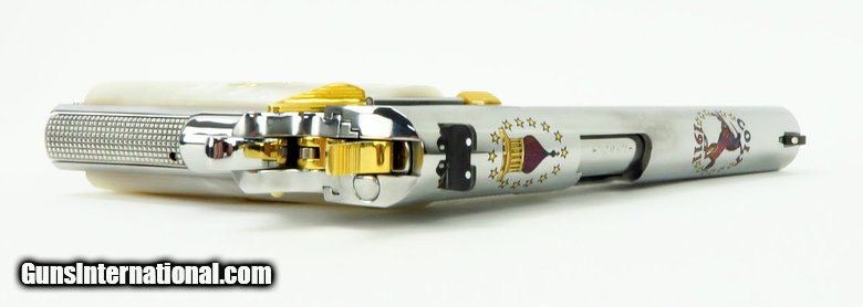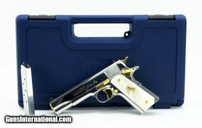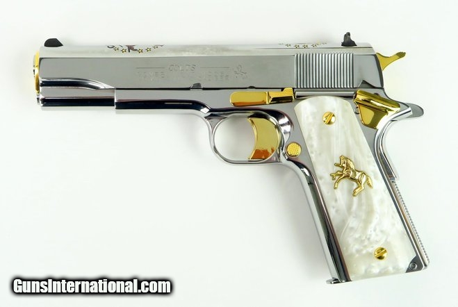 Description: Colt “Gold Stallion” Government .45 ACP caliber pistol. Special Edition with bright stainless finish, gold etched decorations and gold trim. A fancy piece, ready for the barbecue. Excellent condition with box.