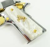 Colt “Gold Stallion” Government .45 ACP caliber pistol. Special Edition with bright stainless finish, gold etched decorations and gold trim. A fancy piece, ready for the barbecue. Excellent condition with box.