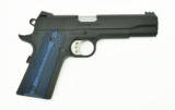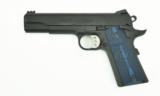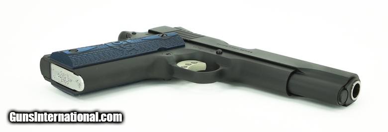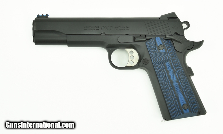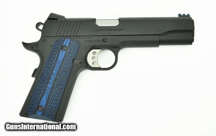 Description: Colt Government Competition .45 Auto caliber pistol. Competition model with fiber optic sight and blue G10 grips.