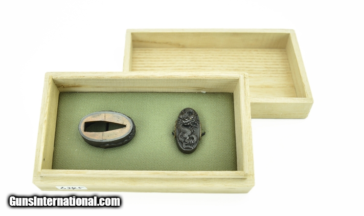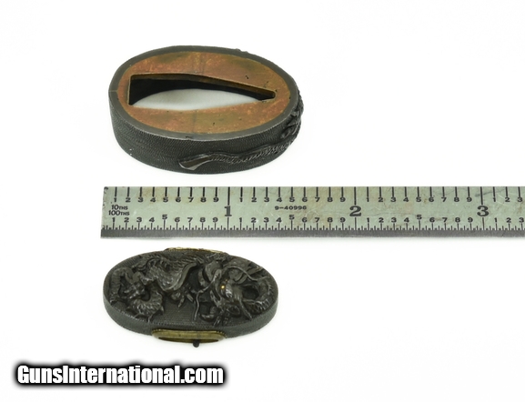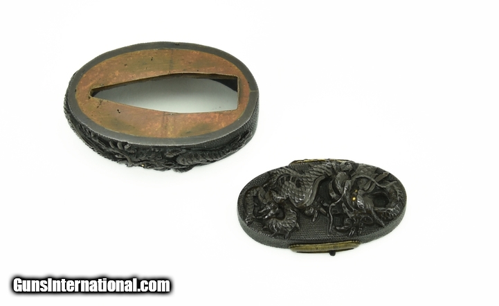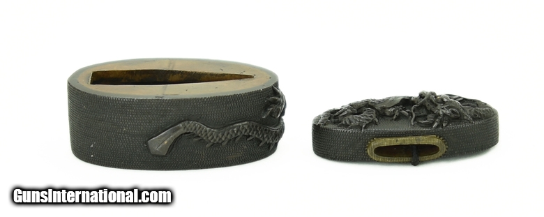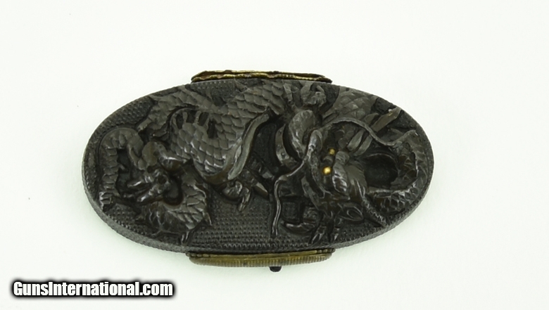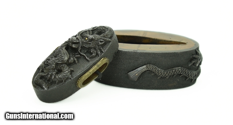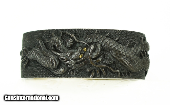 Fuchi Kashira Kinko with dragon with gold eyes. Shakudo with Nanako ground. Unsigned. Very good condition.
