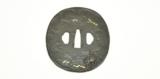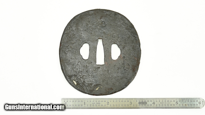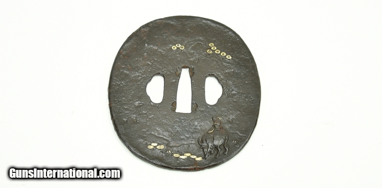 Description: Iron Tsuba. Figure riding Ox with gold and silver patina. SOLD |