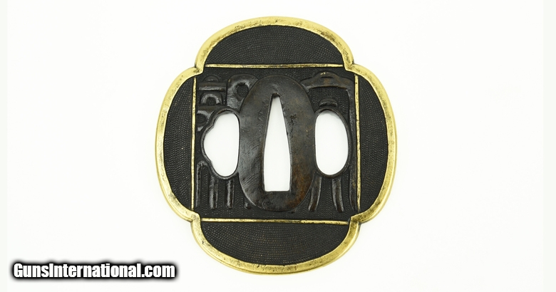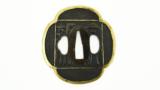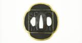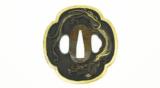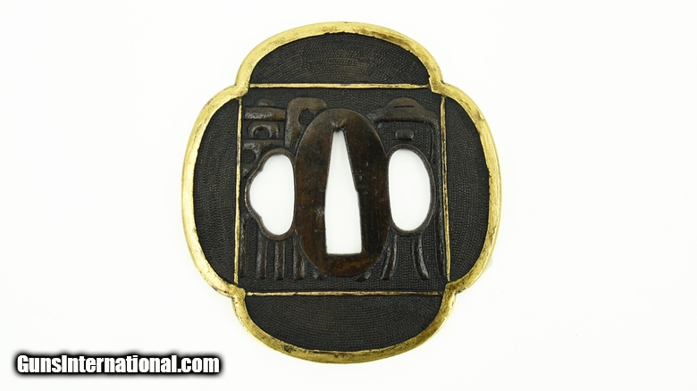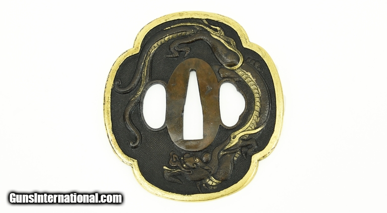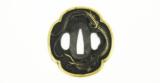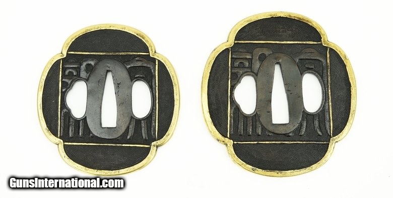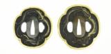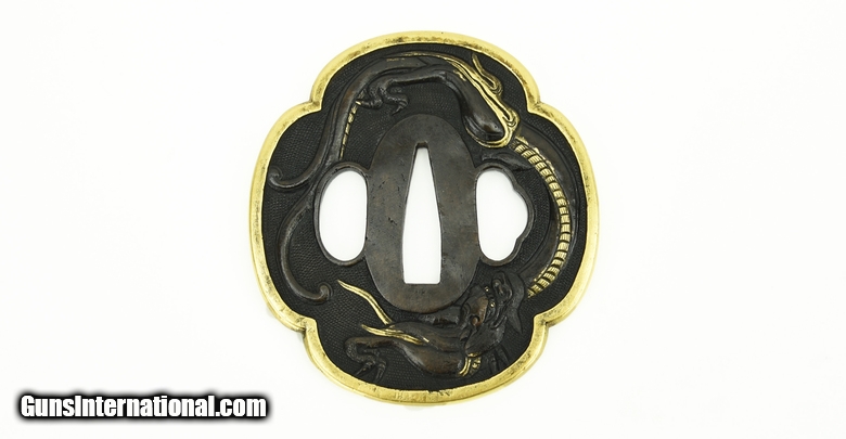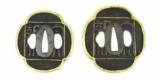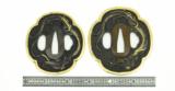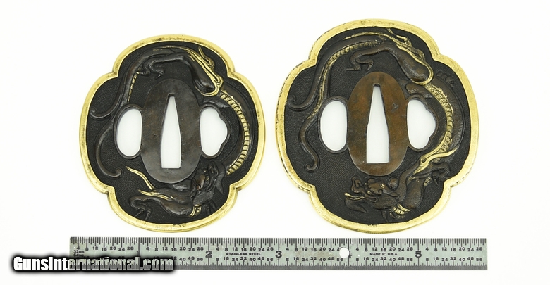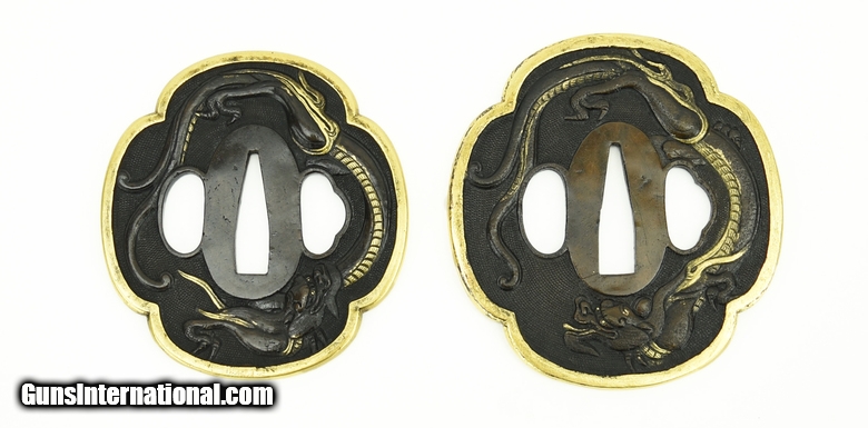Description: Kinko Dai-Sho Tsubas. Shakudo nanako ground. Motif of water dragons with gold highlights. Moko Gata shape. Rims have gold plate. Dai vertical measurement is 3 3/16” (8.1cm); Sho vertical measurement is 2 15/16” (7.5cm). SOLD |