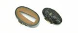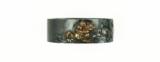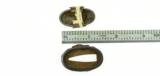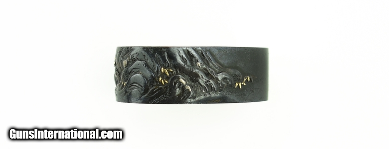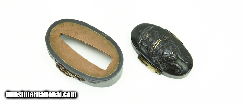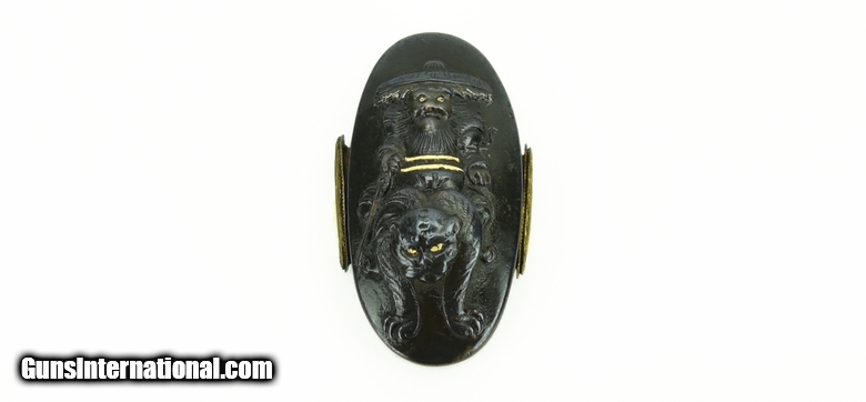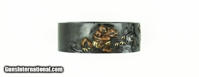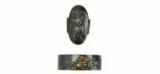 Description: Kinko Fuchi Kashira. Theme of Shoki and Oni. Polished shakudo ground. Gold, shakudo, and copper highlights. Unsigned. SOLD |