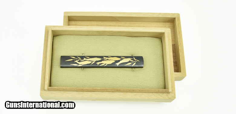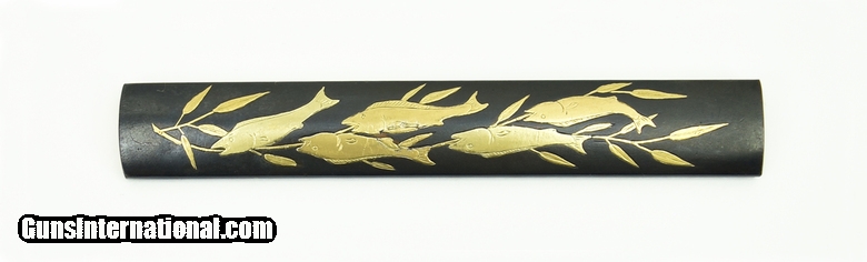 Description: Kinko Kodzuka. Shakudo with School of gold fish amidst Seaweed. Excellent condition and very beautiful. SOLD |