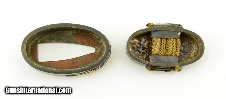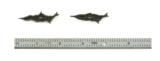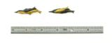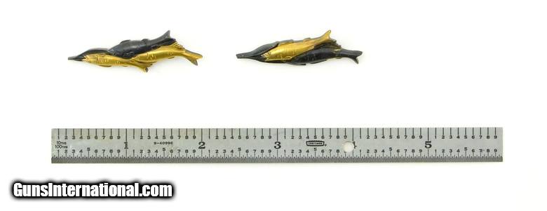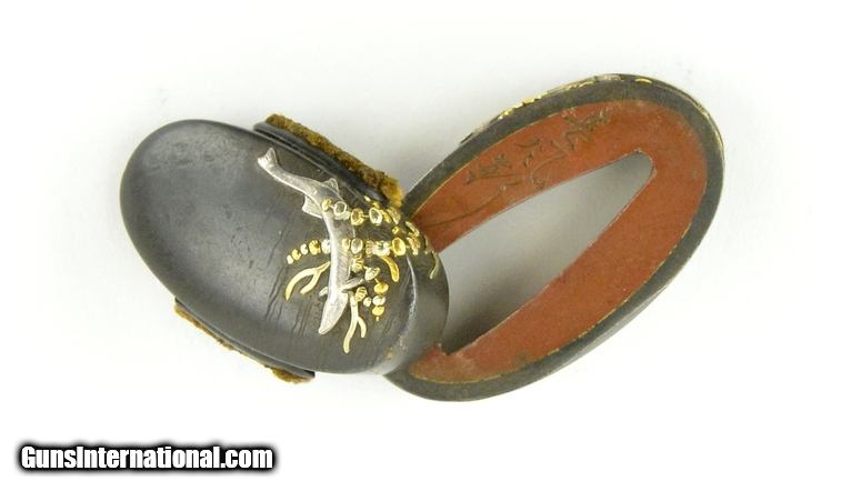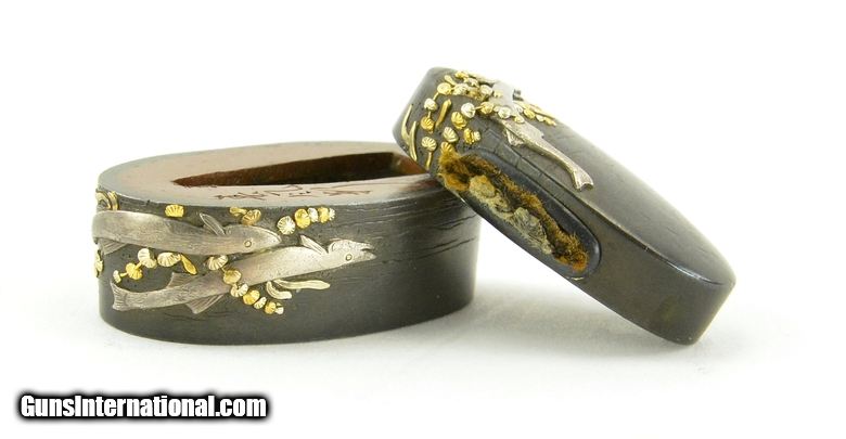 Description: Kinko Fuchi Kashira. Polished Shakudo ground decorated with silver fish amidst gold seaweed. Singed with Kao Kadzuka has school of gold fish. Menuki are gold and shakudo fish. SOLD |