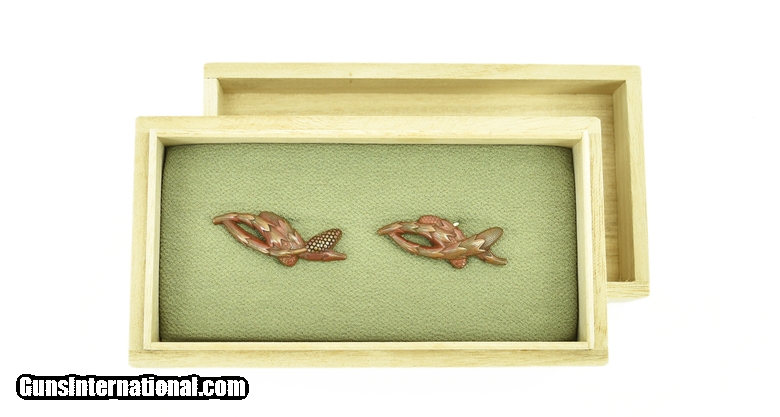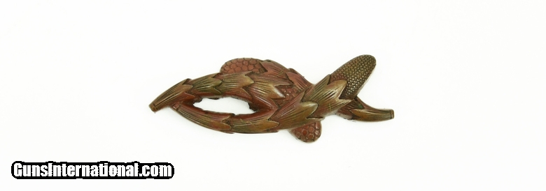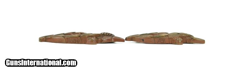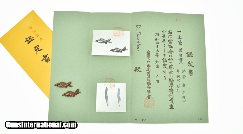 Description: Kinko Menuki of Pine Cones and Branches in copper . Excellent condition with box. Comes with N.B.T.H.K Paper attributing them to Tsune Nao who was student of Nagatsune, circa 1750. SOLD |
