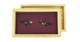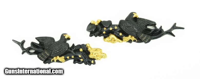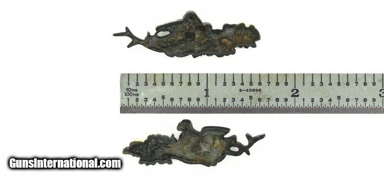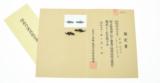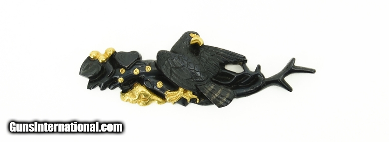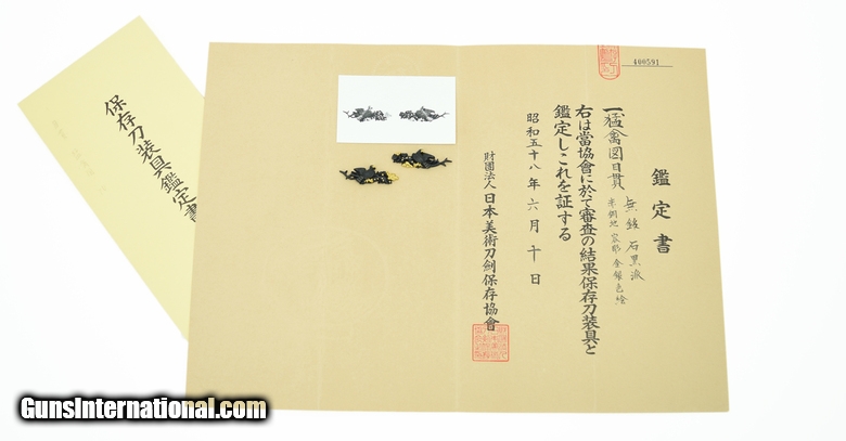Description: Kinko Menuki. Polished shakudo ground. Hawks resting on tree branches with gold highlights. Ishiguro School is highly rated. Very early 19th Century. N.B.T.H.K. Hozon Tokubetsu issued in 1983. Excellent detail. SOLD |