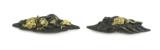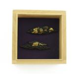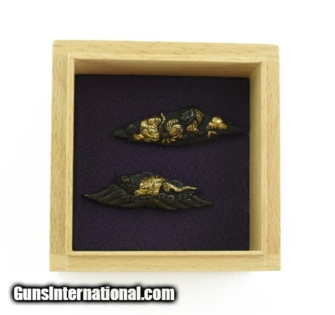 Description: Kinko Menuki. Motif of tigers. One is shakudo nanako ground with gold highlights with foliage. The other is polished shakudo ground of tigers amidst waves with gold highlights. Unsigned. Boxed. SOLD |