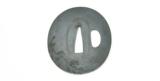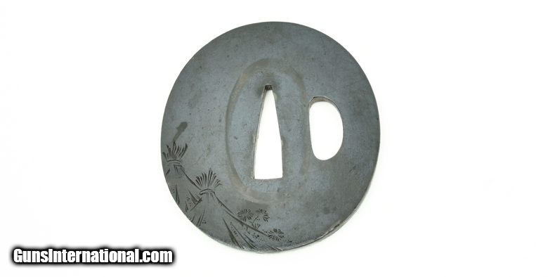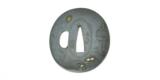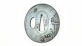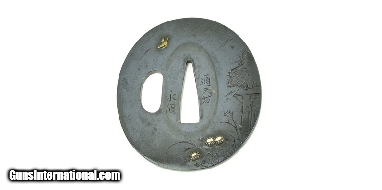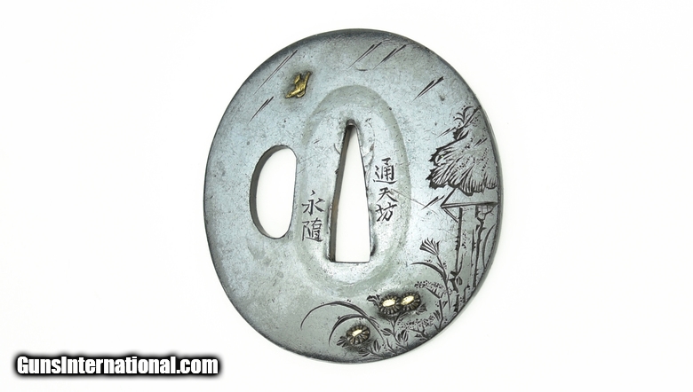 Description: Kinko Tsuba. Scene with house, flowers, and bird. Signed: Naga Yuki. Shakudo. SOLD |