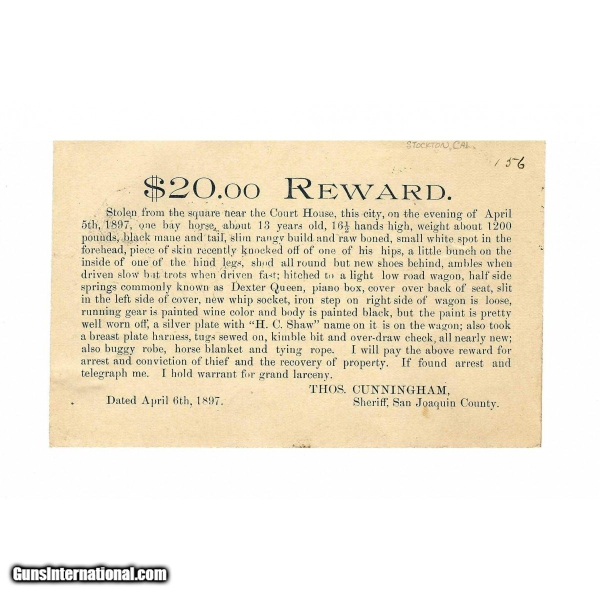 $20.00 REWARD card for a horse and buggy stolen on April 5th 1897 near the court house on Joaquin County. The card gives a full description of the horse and buggy that were stolen. Over all good condition! This item / These items came from John Flood who was Wyatt and Sadie Earp’s personal Secretary and closest confidant. Mr. Flood even wrote a biography on Wyatt Earp that was never published. He was given and inherited numerous items from the Earp’s. Mr. Flood in turn passed the Earp collection on to John Gilchriese. Mr. Gilchriese owned and operated The Wyatt Earp Museum in Tombstone, AZ, where all of these items were displayed. These items were sold directly by Mr. Gilchriese to David Roberts along with Mr. Gilchriese’s notes on each item. Each item comes with a certificate of authenticity from Collectors Firearms.
