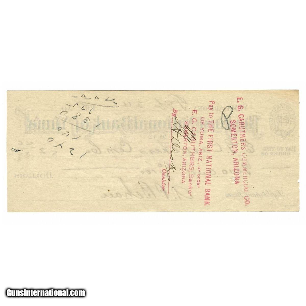 Antique First National Bank of Yuma check for $2.40 dated 1917 to Carruthers. These items came from John Flood who was Wyatt and Sadie Earp’s personal Secretary and closest confidant. Mr. Flood even wrote a biography on Wyatt Earp that was never published. He was given and inherited numerous items from the Earp’s. Mr. Flood in turn passed the Earp collection on to John Gilchriese. Mr. Gilchriese owned and operated The Wyatt Earp Museum in Tombstone, AZ, where all of these items were displayed. These items were sold directly by Mr. Gilchriese to David Roberts along with Mr. Gilchriese’s notes on each item. Each item comes with a certificate of authenticity from Collectors Firearms.