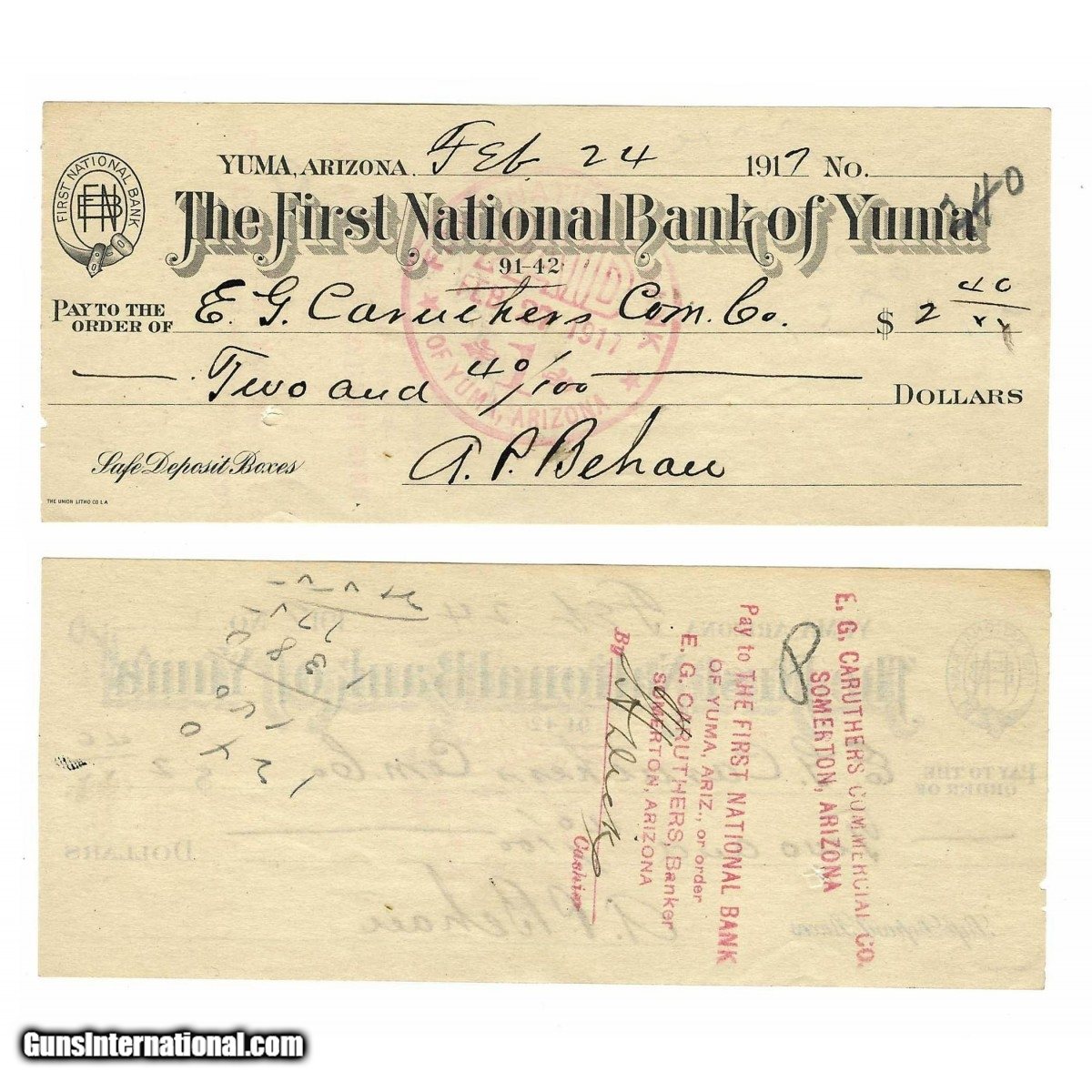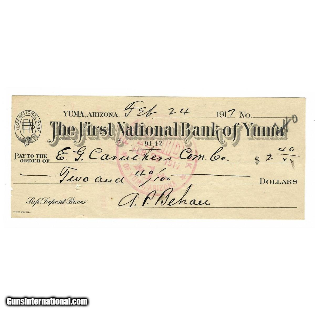 "Antique First National Bank of Yuma Check for $2.40 Dated 1917 to Carruthers (WEC189)