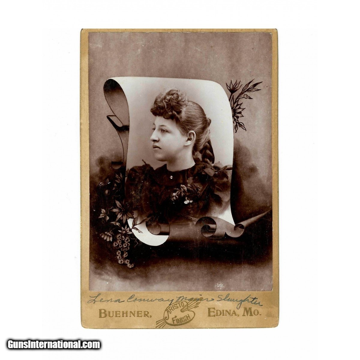 Beautiful CDV photo of Lena Slaughter taken in Edina, MO Circa 1890s. This item / These items came from John Flood who was Wyatt and Sadie Earp’s personal Secretary and closest confidant. Mr. Flood even wrote a biography on Wyatt Earp that was never published. He was given and inherited numerous items from the Earp’s. Mr. Flood in turn passed the Earp collection on to John Gilchriese. Mr. Gilchriese owned and operated The Wyatt Earp Museum in Tombstone, AZ, where all of these items were displayed. These items were sold directly by Mr. Gilchriese to David Roberts along with Mr. Gilchriese’s notes on each item. Each item comes with a certificate of authenticity from Collectors Firearms.