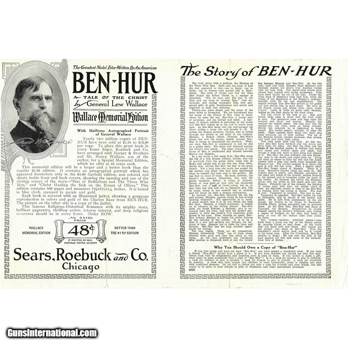 Ben-Hur Wallace Memorial Edition by Sears, Roebuck and Co. Magazine Ad. Overall good condition. This item / These items came from John Flood who was Wyatt and Sadie Earp’s personal Secretary and closest confidant. Mr. Flood even wrote a biography on Wyatt Earp that was never published. He was given and inherited numerous items from the Earp’s. Mr. Flood in turn passed the Earp collection on to John Gilchriese. Mr. Gilchriese owned and operated The Wyatt Earp Museum in Tombstone, AZ, where all of these items were displayed. These items were sold directly by Mr. Gilchriese to David Roberts along with Mr. Gilchriese’s notes on each item. Each item comes with a certificate of authenticity from Collectors Firearms.