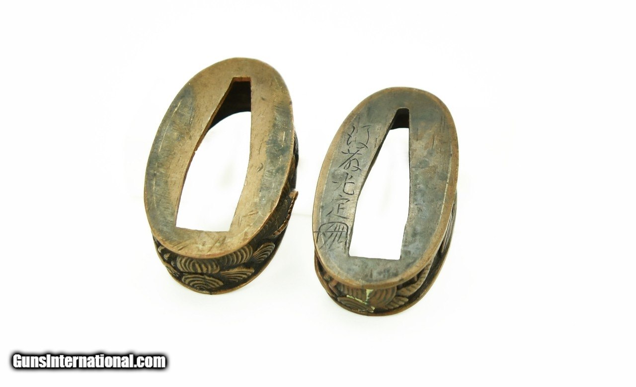 Description: "Dai- Sho Fuchi Kashira Motif is Dragon in Waves. Copper colored. One Fuchi signed: Goto Mitsu Sada. Very good condition. SOLD |