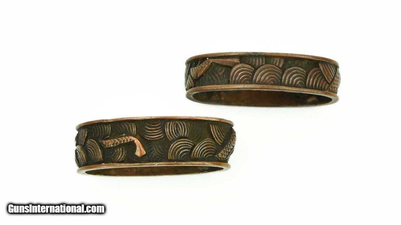 Description: "Dai- Sho Fuchi Kashira Motif is Dragon in Waves. Copper colored. One Fuchi signed: Goto Mitsu Sada. Very good condition. SOLD |