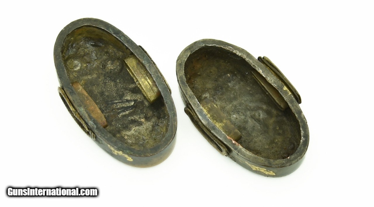 Description: "Dai-Sho Fuchi Kashira Kinko (soft metal) of swirling dragoons with gold highlights. Both Fuchi signed. Very good condition. SOLD |