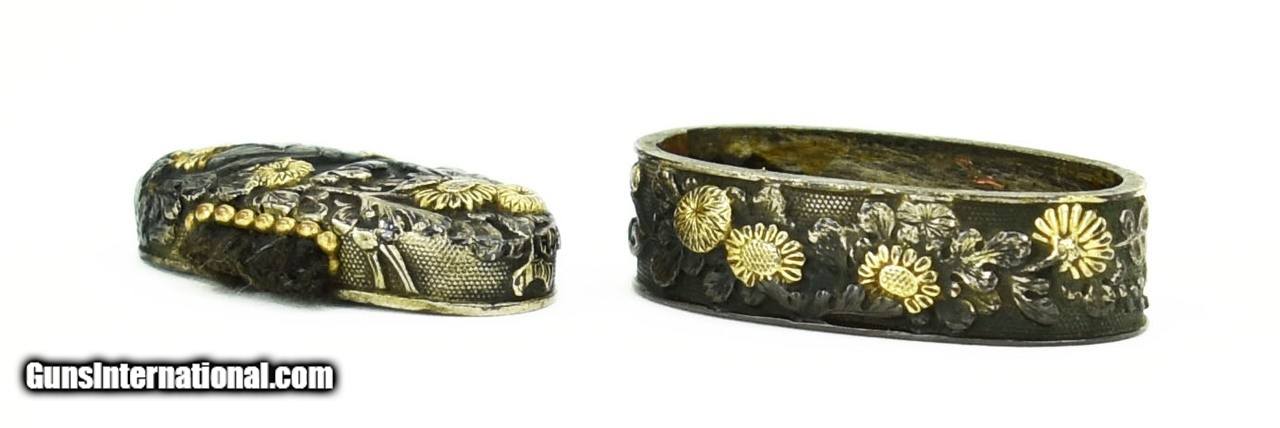 Description: "Fuchi Kashira Foliage with Insects: gold and silver highlights fine shakudo Nanako. Excellent condition. SOLD |