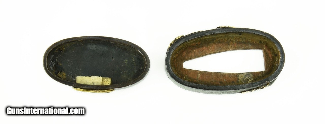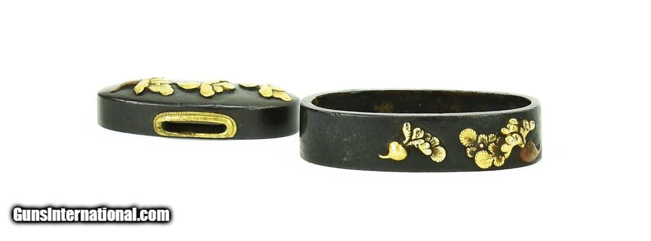 Description: "Fuchi Kashira Shakudo Ishime finish. Flower Motif with gold and copper highlights. Excellent conditions. SOLD |