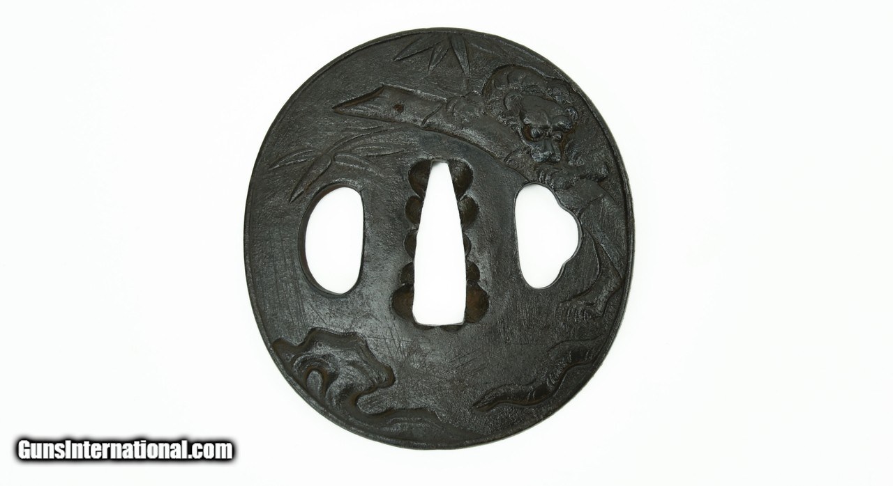 Description: "Iron Tsuba with tiger in tree. Diameter: 6.7cm, 2 ½". SOLD |