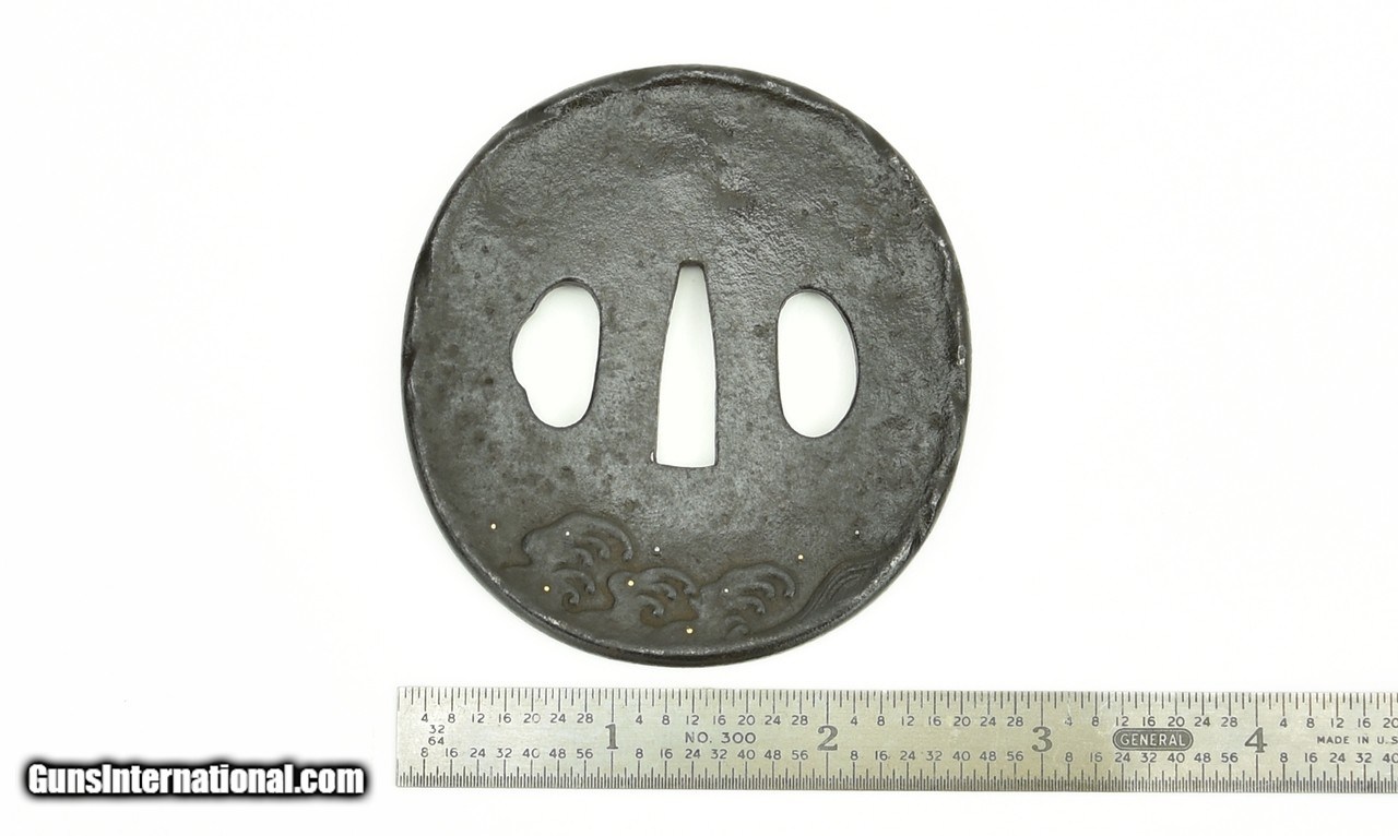 Description: "Iron Tsuba. Old figure with ornate robe standing on sword below figure. On the reverse are waves with gold and silver. SOLD |