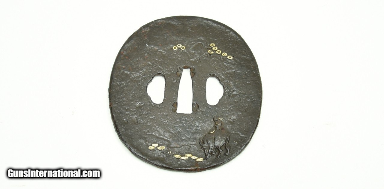 Description: "Iron Tsuba. Figure riding Ox with gold and silver patina. SOLD |