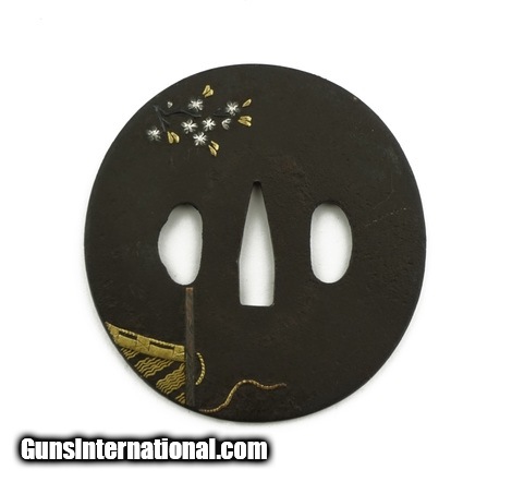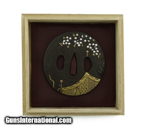 Description: "Iron Tsuba. Round or maru gata with cherry blossoms with gold tent. Boxed. SOLD |