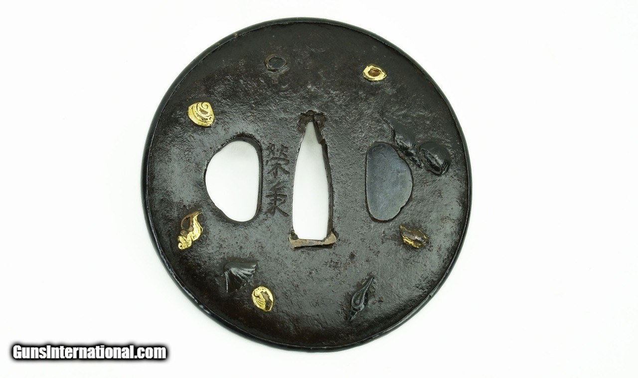 Description: "Iron Tsuba Shakudo Rim Seashell Motif. Diameter: 7.5 cm, 3". SOLD |