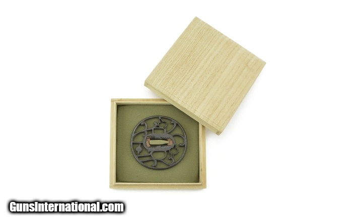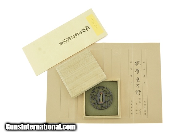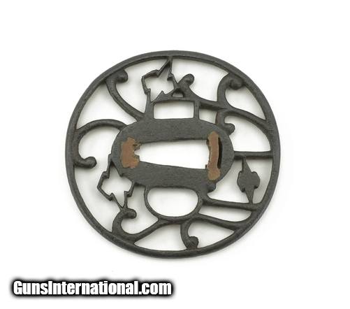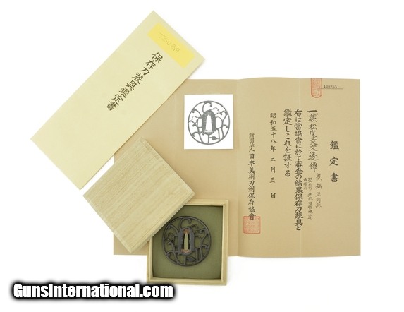 Description: "Iron Tsuba Sukashi. Unsigned. Attributed to Shoami School by the N.B.T.H.K. in 1983. SOLD |