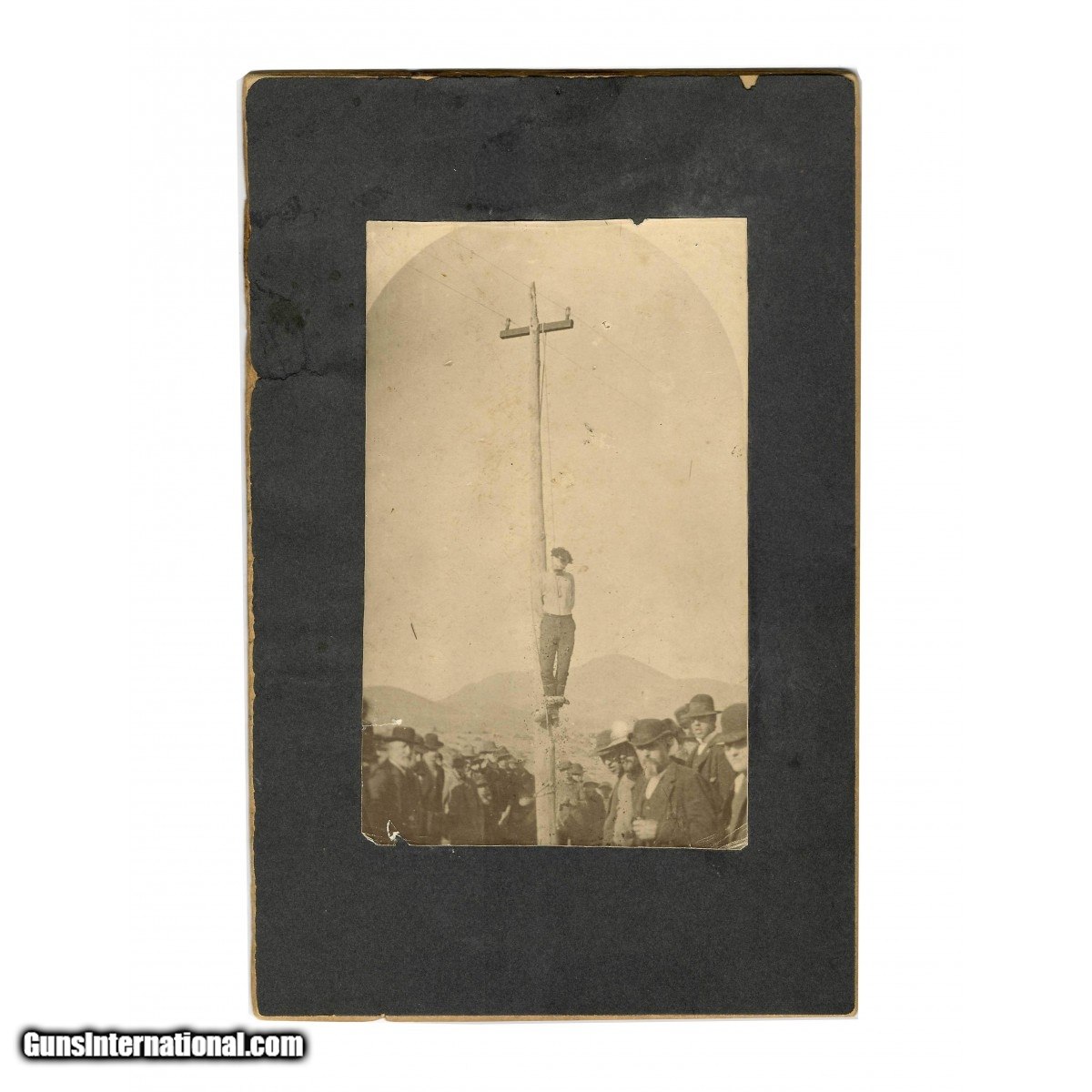 Description: " John Heath Lynching Photo of the only man to have been lynched in Tombstone, AZ. This lynching took place after the Bisbee robbery. Heath was a member of the robbers and shot John C. Tappinier during the robbery. The posse strung him up on February 22, 1884. SOLD |