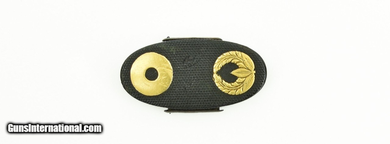 Description: "Kinko Fuchi Kashira. Motif with various Mon in gold. Shakudo nanako ground. SOLD |