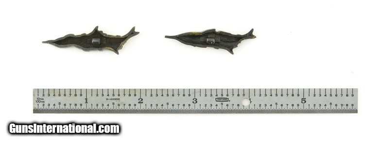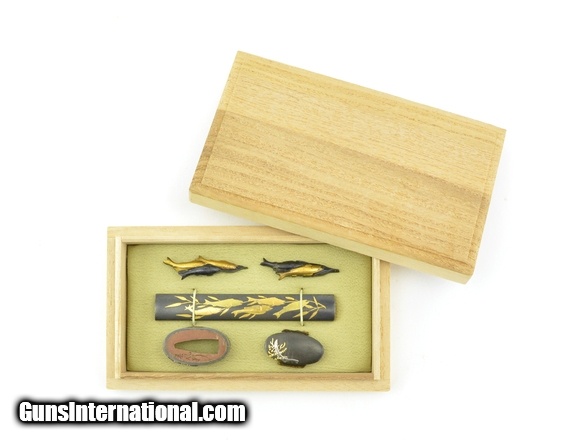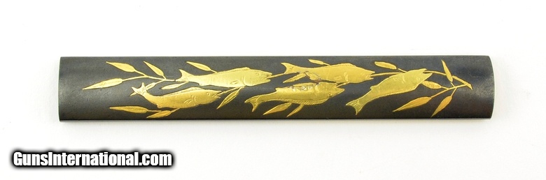 Description: "Kinko Fuchi Kashira. Polished Shakudo ground decorated with silver fish amidst gold seaweed. Singed with Kao Kadzuka has school of gold fish. Menuki are gold and shakudo fish. SOLD |