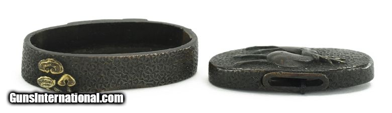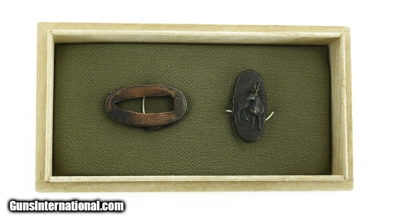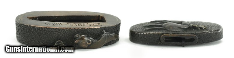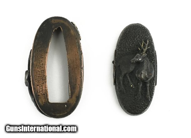 Description: "Kinko Fuchi Kashira. Unusual coarse Ishime ground. Kashira has stag and Fuchi has bat with foliage. Tanto size. Signed. Boxed. SOLD |