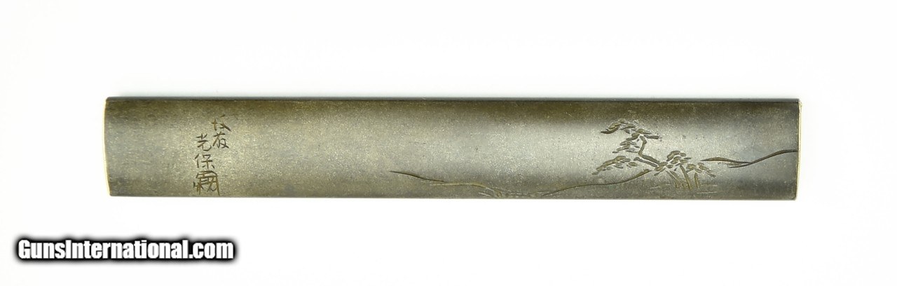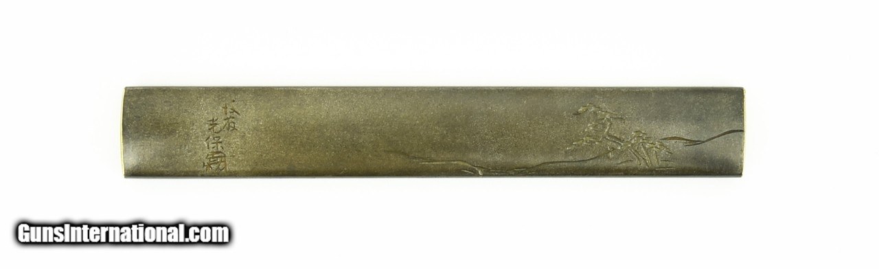 Description: "Kinko Kodzuka. Shakudo Nanako ground. Grazing gold horse by stream with foliage. Reverse has trees and mountain. Signed: Goto Mitsu Yasu (1794-1851). Kinko Meikan Page 508a. Superior quality. SOLD |