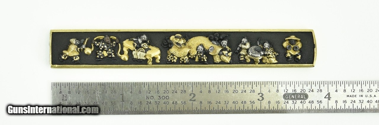 Description: "Kinko Kodzuka. Motif of Chinese boys engaging in dance with accompanying music. Gold, silver and Shakudo highlights. Shakudo Nanako ground. Reverse has gold cat-scratch pattern. Unsigned Goto School. SOLD |