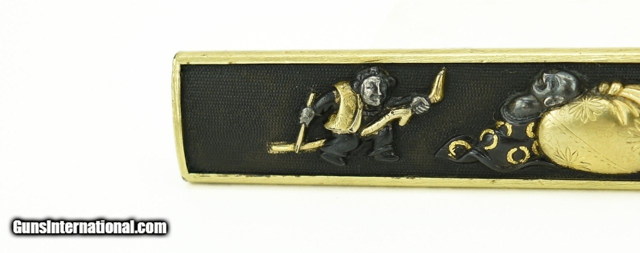 Description: "Kinko Kodzuka. Scene of Hotei leaning against his sack of treasures while Chinese boys play with rooster. Gold cat-scratch on reverse. Unsigned. Goto School. SOLD |