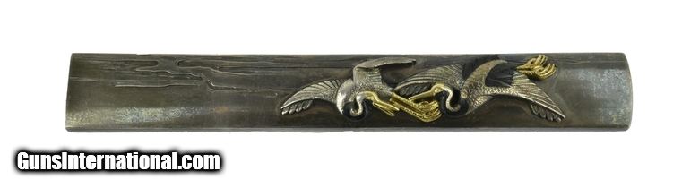 Description: "Kinko Kodzuka. Polished tarnished silver. High relief silver cranes in flight with gold and shakudo highlights. Reverse has silver cat-scratch pattern. Signed on tip end. SOLD |