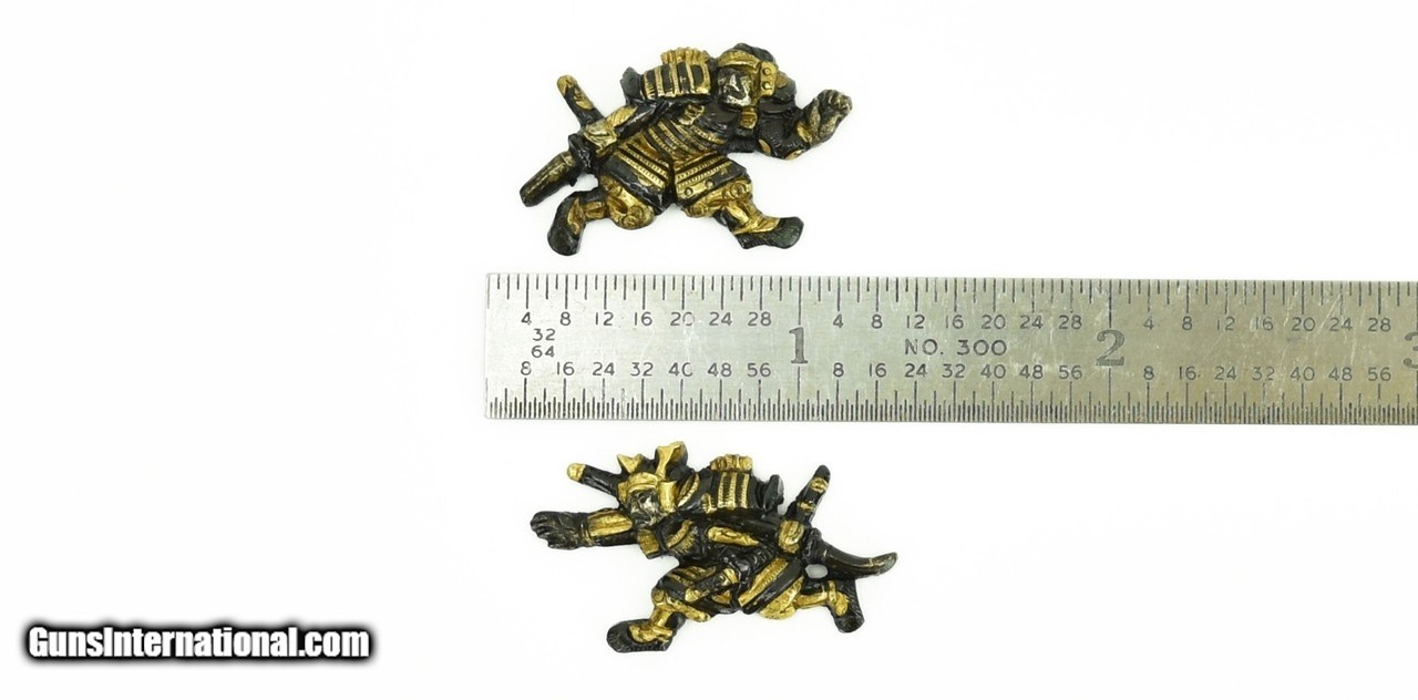 Description: "Kinko Menuki. Samurai Warriors in Armor. Gold, silver, and Shakudo highlights. SOLD |