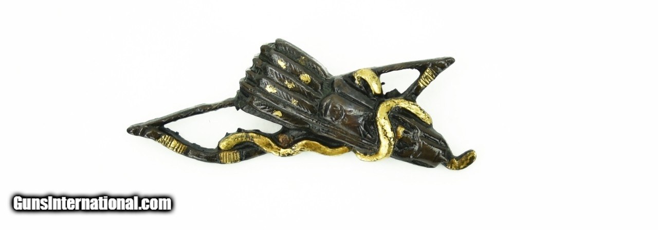 Description: "Kinko Menuki. Bow and arrow theme. Good detail. Shakudo with gold highlights. SOLD |