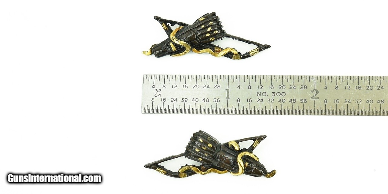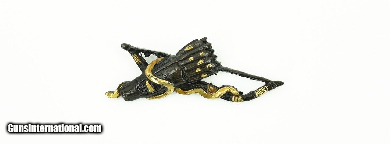 Description: "Kinko Menuki. Bow and arrow theme. Good detail. Shakudo with gold highlights. SOLD |